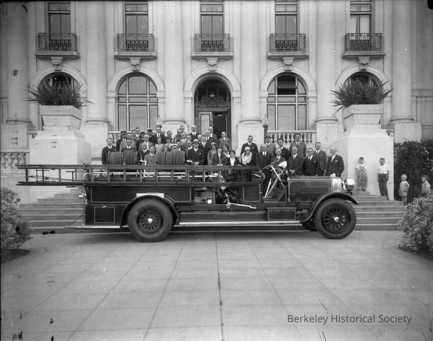 Fire truck parked at City Hall steps, group assembled on steps.