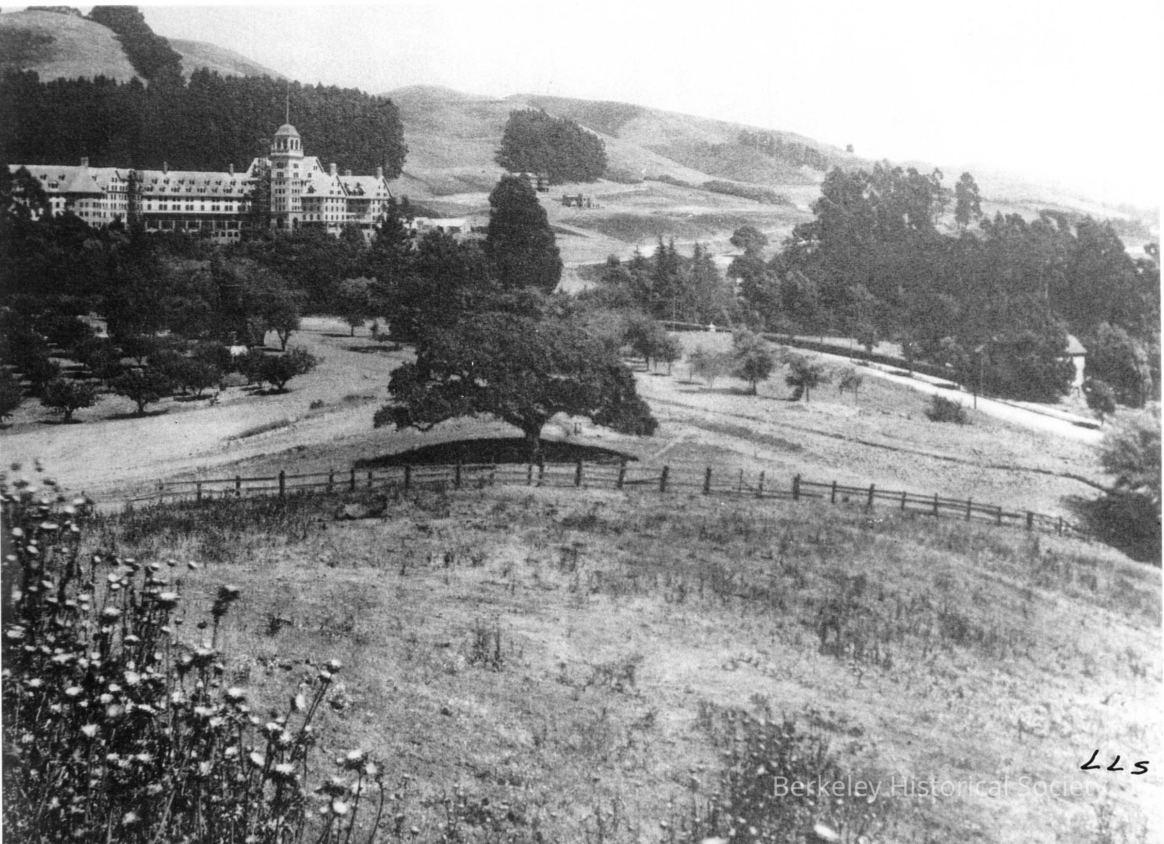 View of the Claremont Hotel from the northwest. (Trees and grasslands in foreground)