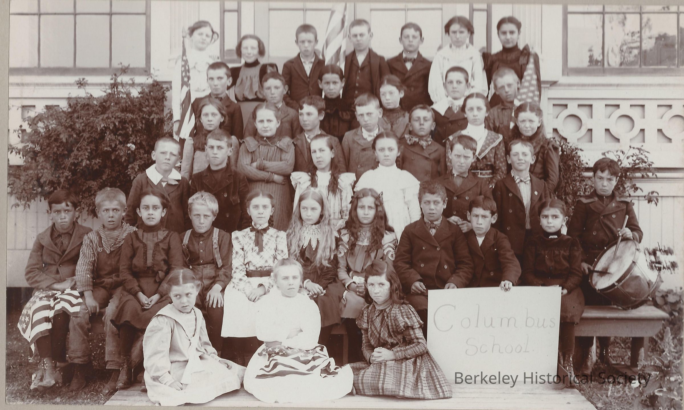 Class with "Colombus School" sign, one student with a drum on the left side, three American flags on the higher row, two flags folded on the students' laps in the first rowsMade/Created