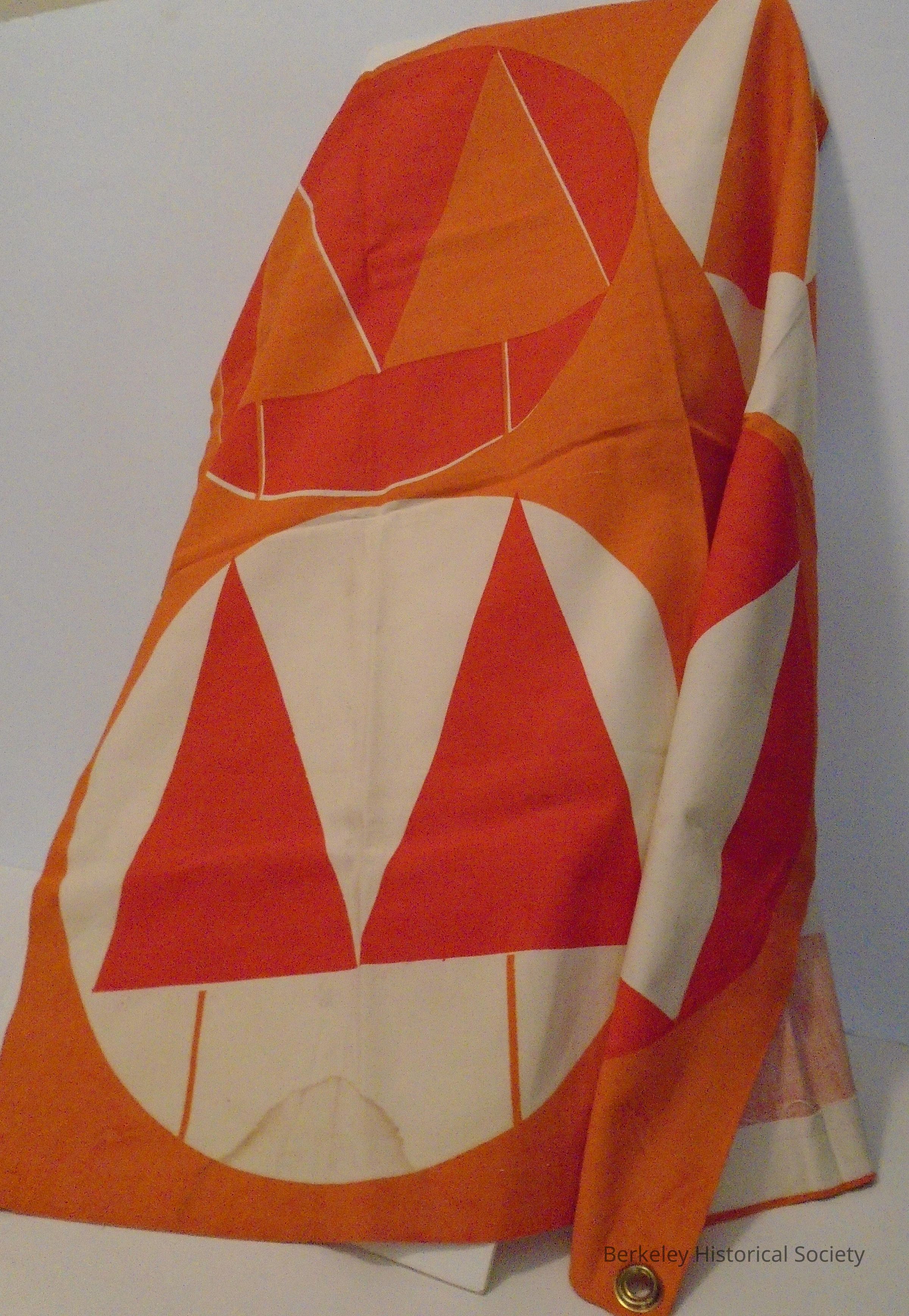 Square cloth/canvas banner for Consumers Co-op of Berkeley. Four orange, gold and white logos of 2 pine trees in a circle. Brass colored grommets on all four sides.