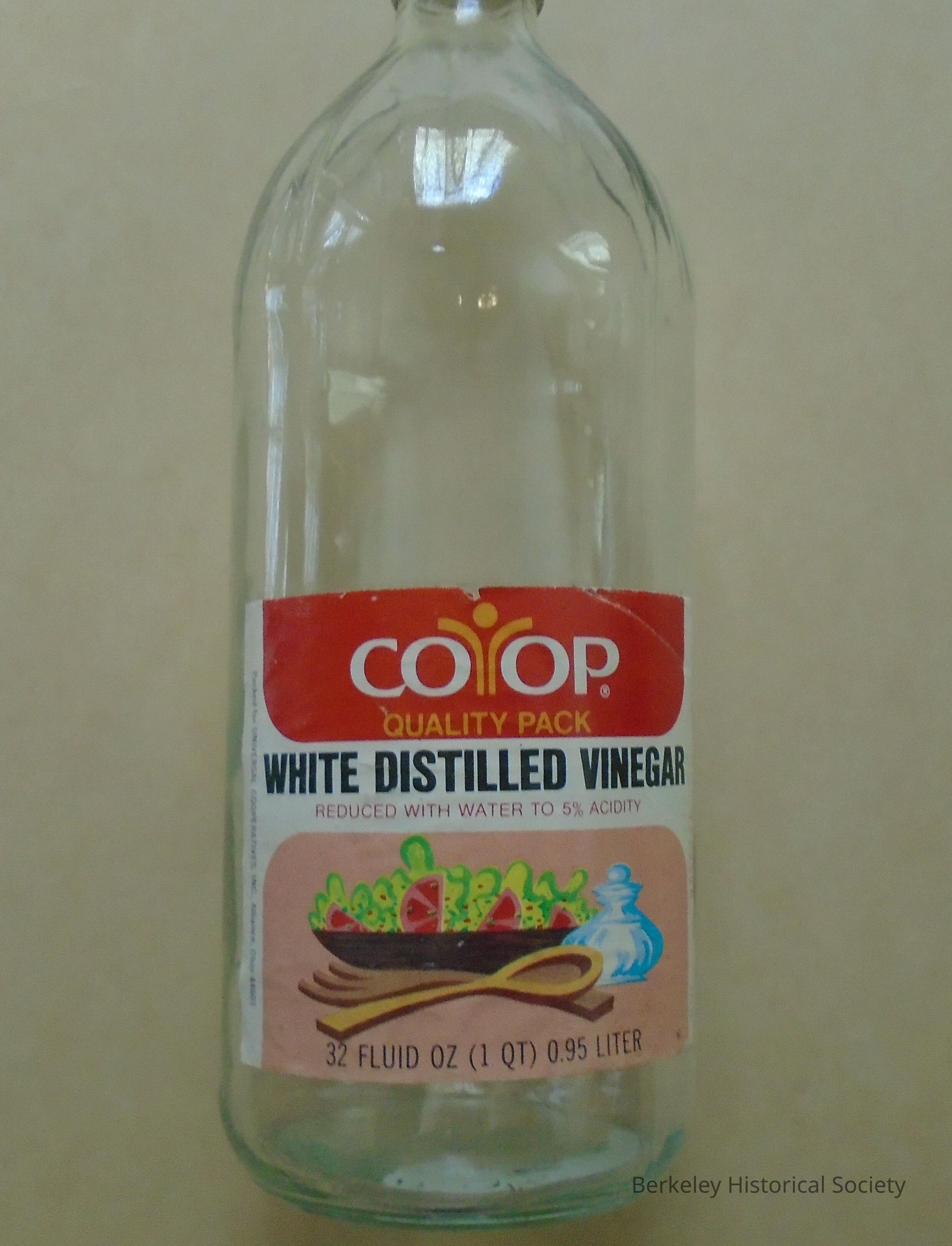 Co-op vinegar bottle, 1 quart, white distilled. Paper label with picture of a salad in misc. colors.