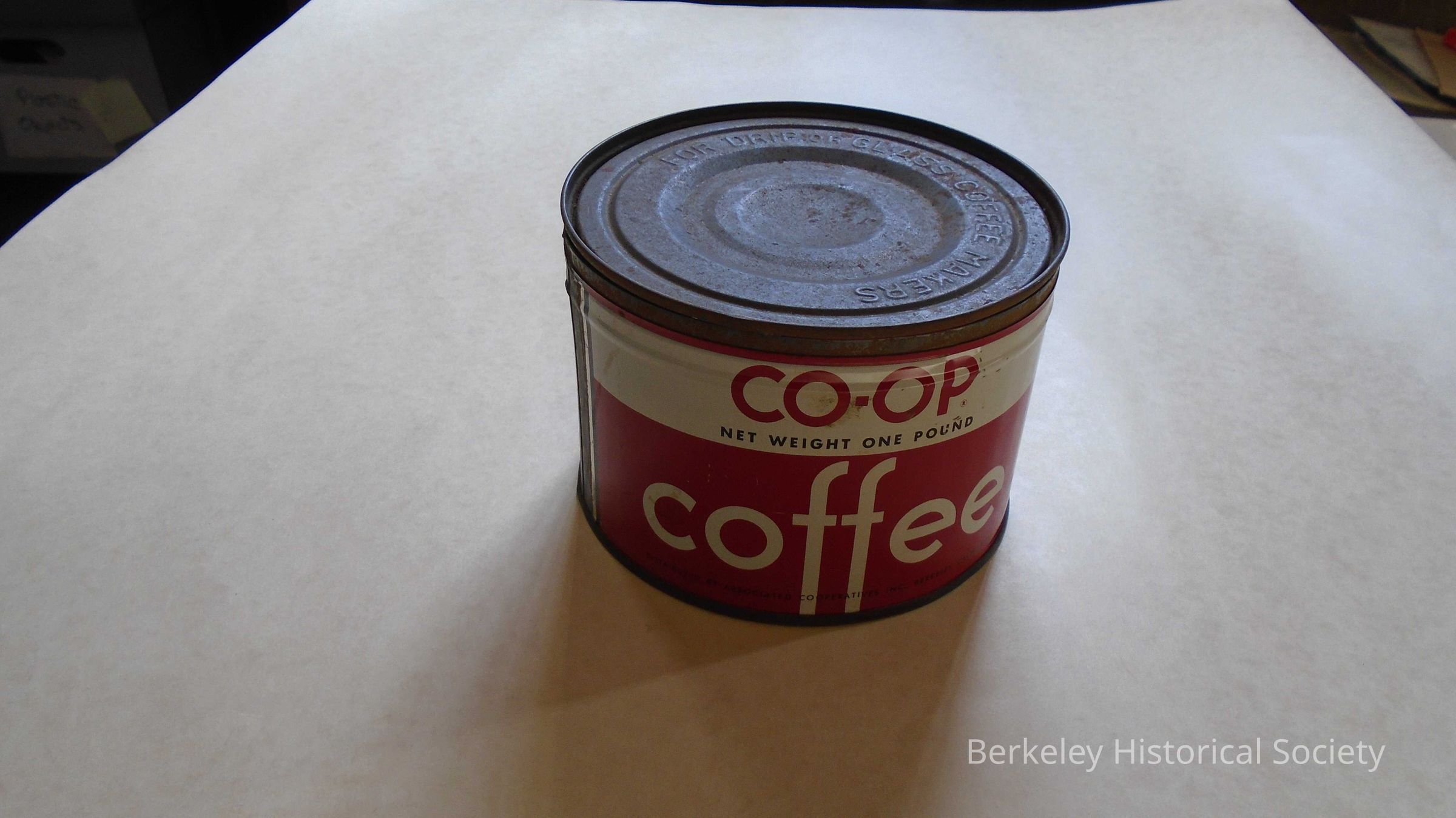 Co-op coffee can or tin. One pound. Plain red & white label with "Distributed by Associated Cooperatives inc. Berkeley, California".