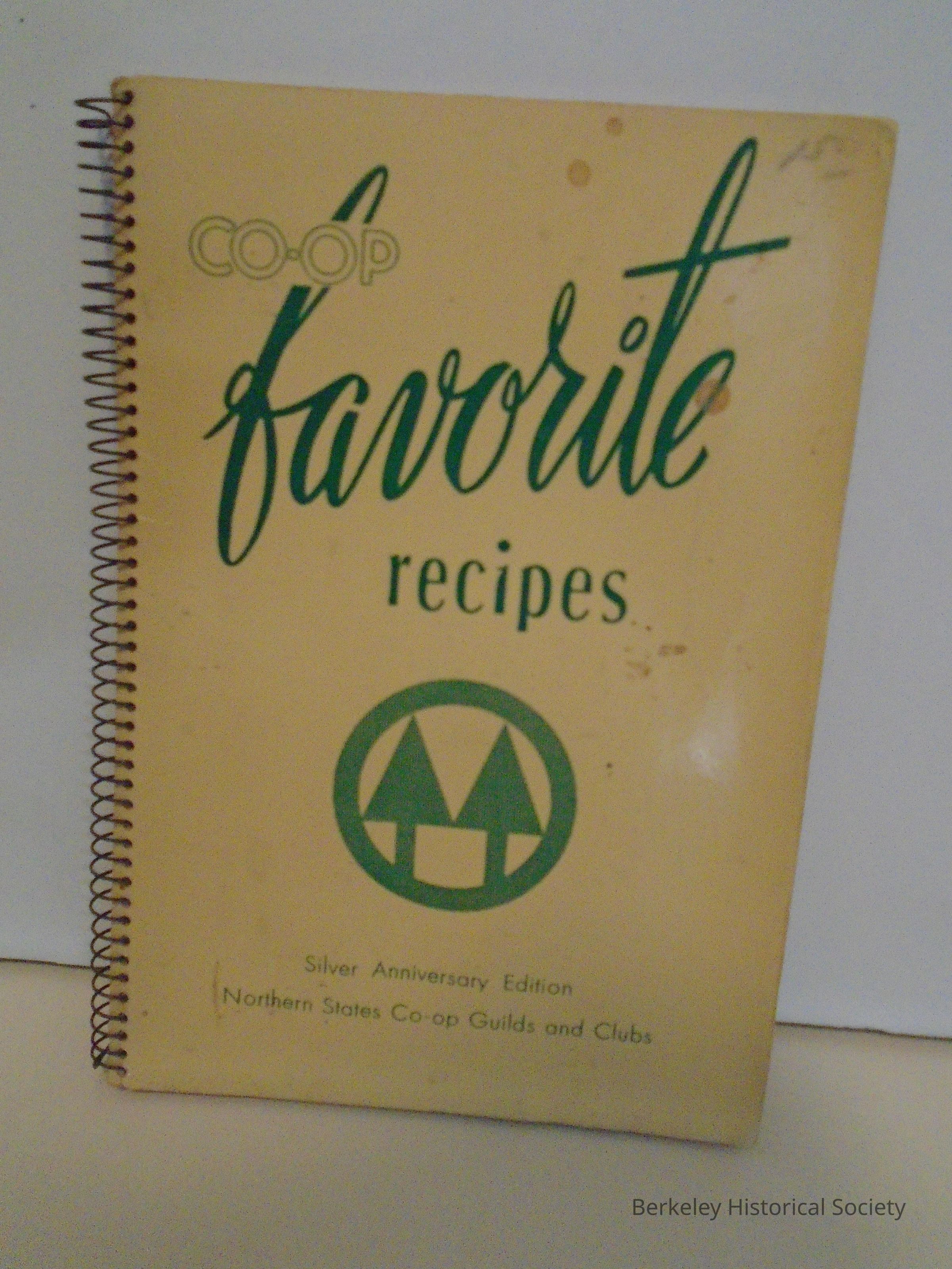 Softcover paper cookbook: "Co-op favorite recipes" Silver Anniversary Edition, Northern States Co-op Guilds and Clubs. Copyright 1955, by Olaf Hanson, Duluth, Minn. Printed by Cooperative Publishing Association, Superior, Wisconsin. Spiral binding, 111 pages. Co-op logo of two trees in a circle on the front cover.Lexicon