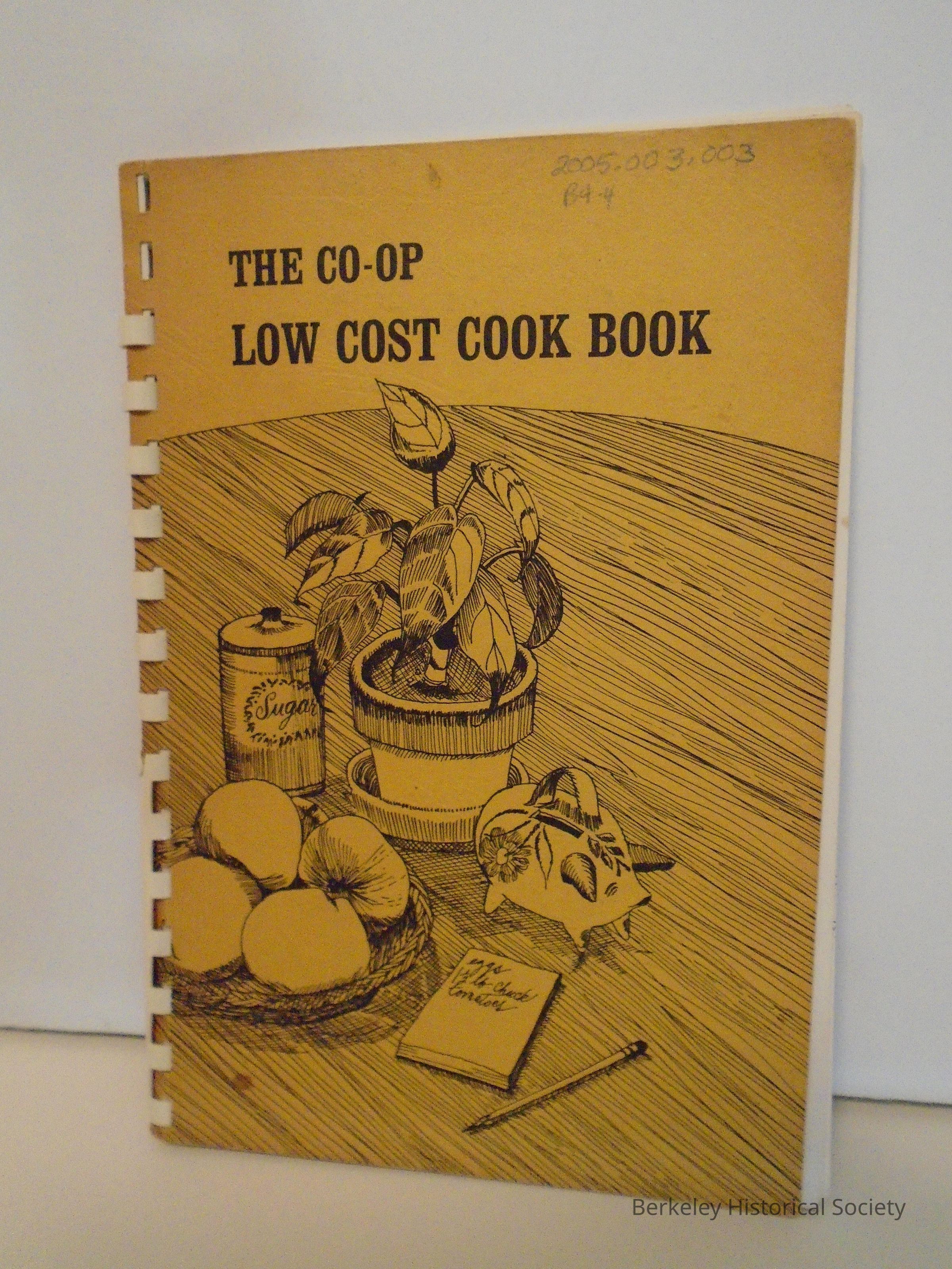 Softcover (paper) cookbook: "The Co-op Low Cost Cook Book". Published by Consumers Cooperative of Berkeley, Inc., copyright 1965. Gold cover with pictures of plant, vegetables, tablet with plastic spiral binder. Printed by Brekas Typesetting. 78 pages.Lexicon