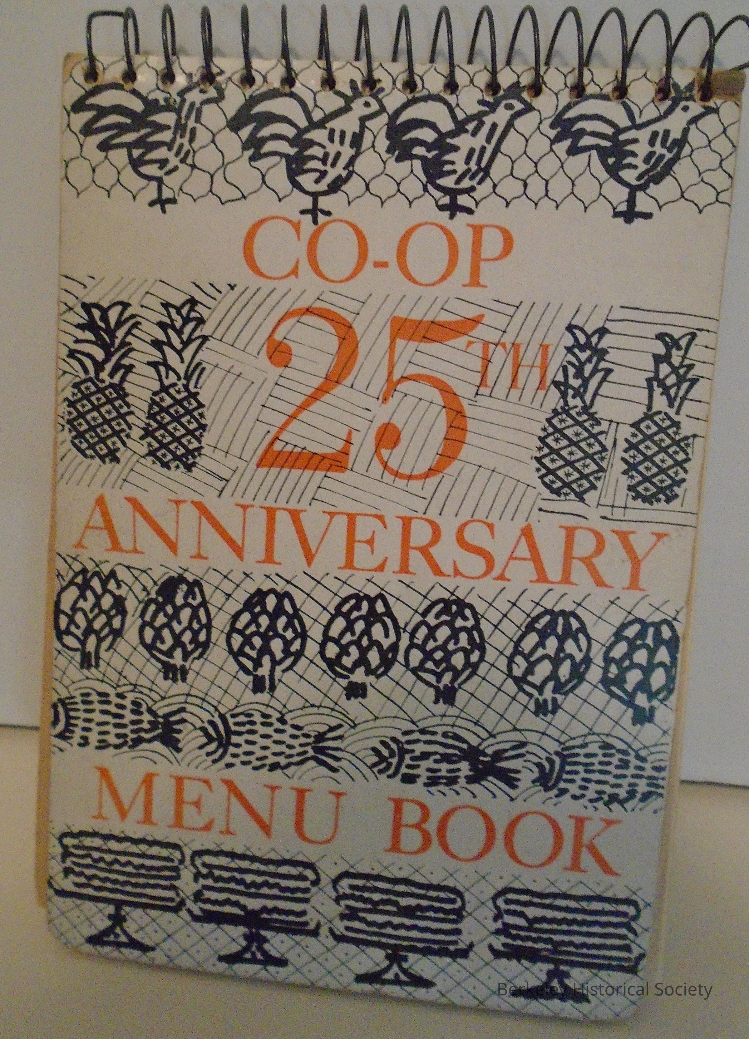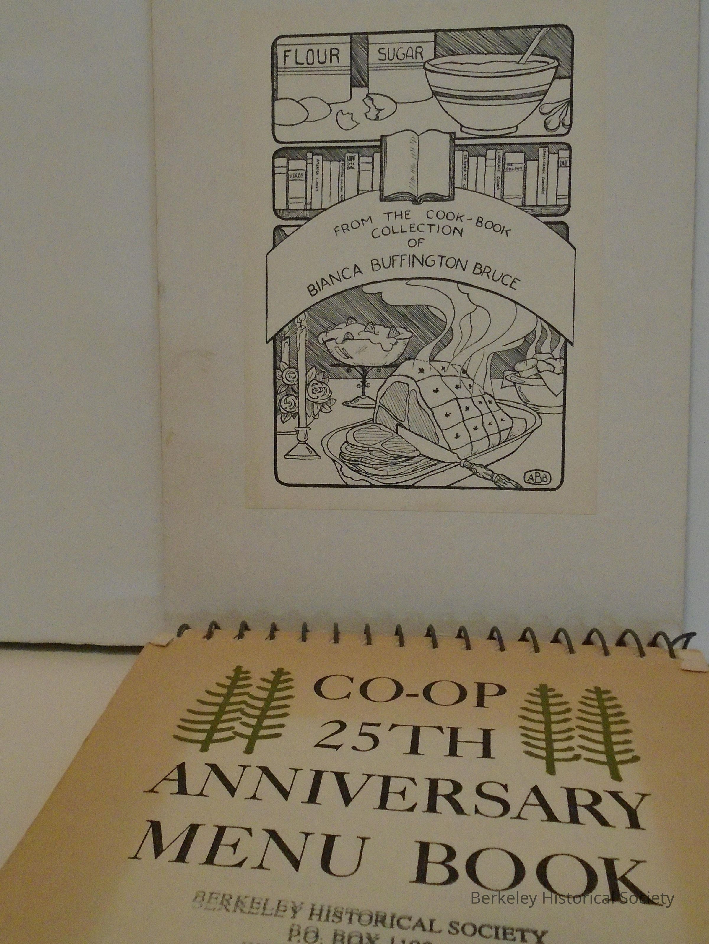 Softcover paper cookbook: "CO-OP 25th ANNIVERSARY MENU BOOK" published by Consumers Cooperative of Berkeley, Inc., copyright 1962. Printed in Berkeley, Calif., by Gillick Printing, Inc. Wire spiral binding. Cover white with black drawings and orange print. 112 pages. From the cook-book collection of Bianca Buffington Bruce.Made/Created