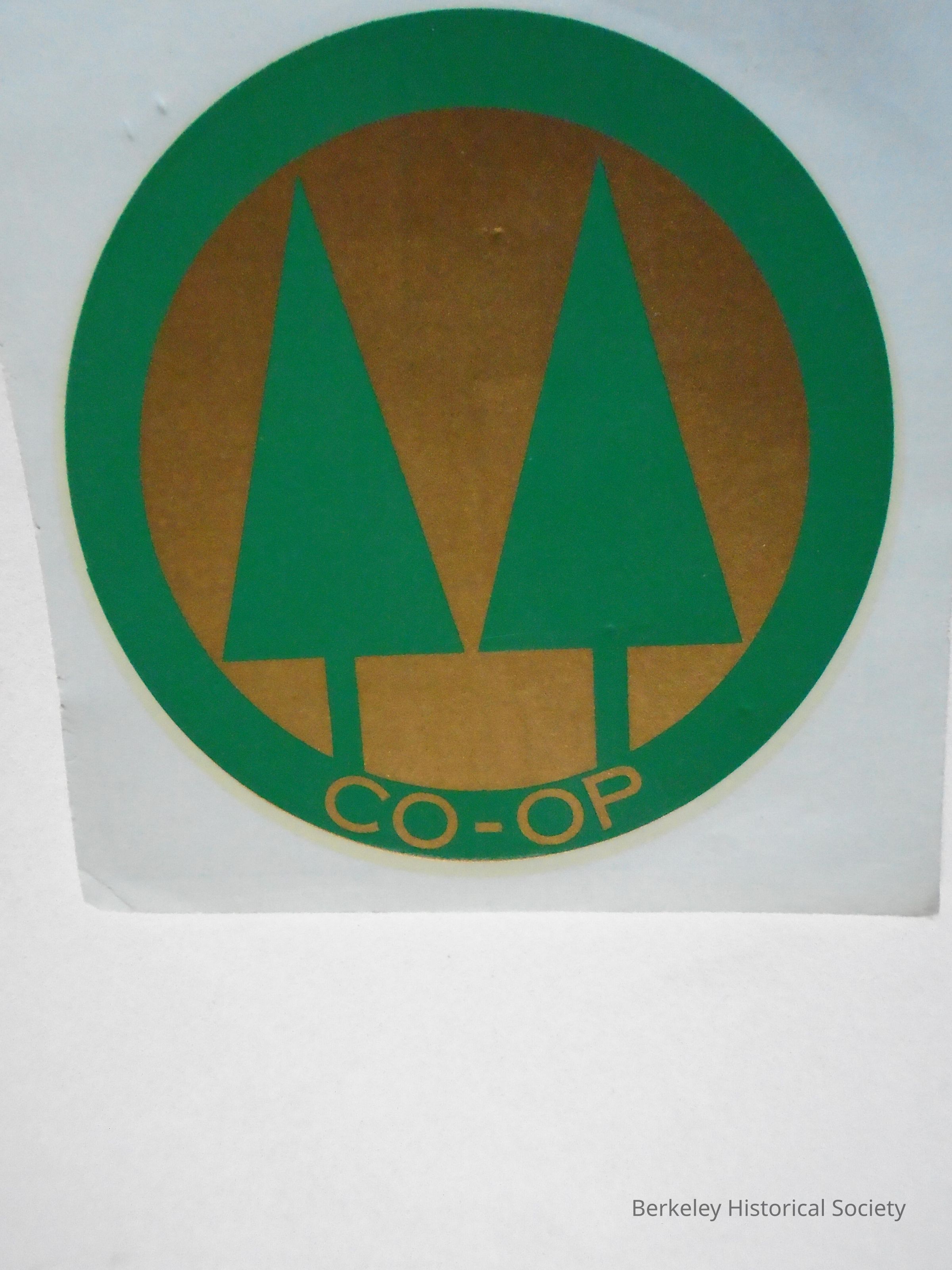 Round, paper Co-op decal with logo of 2 trees. Green and gold.