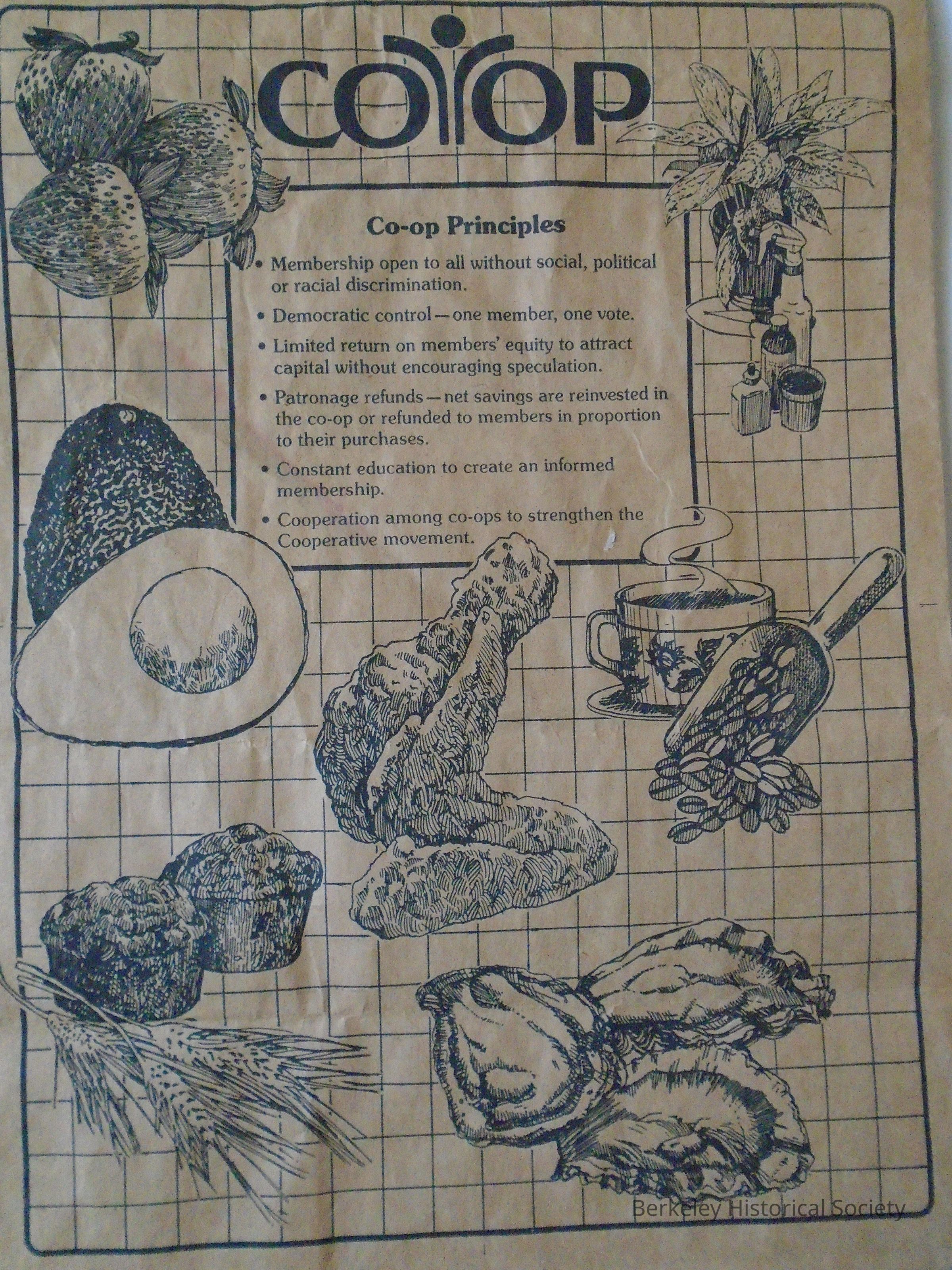 Brown paper grocery bag from the Co-op in Berkeley. Shows pictures of food items and lists the Co-op Principles. Also, a duplicate bag and several others in 2022.400.018.Lexicon
