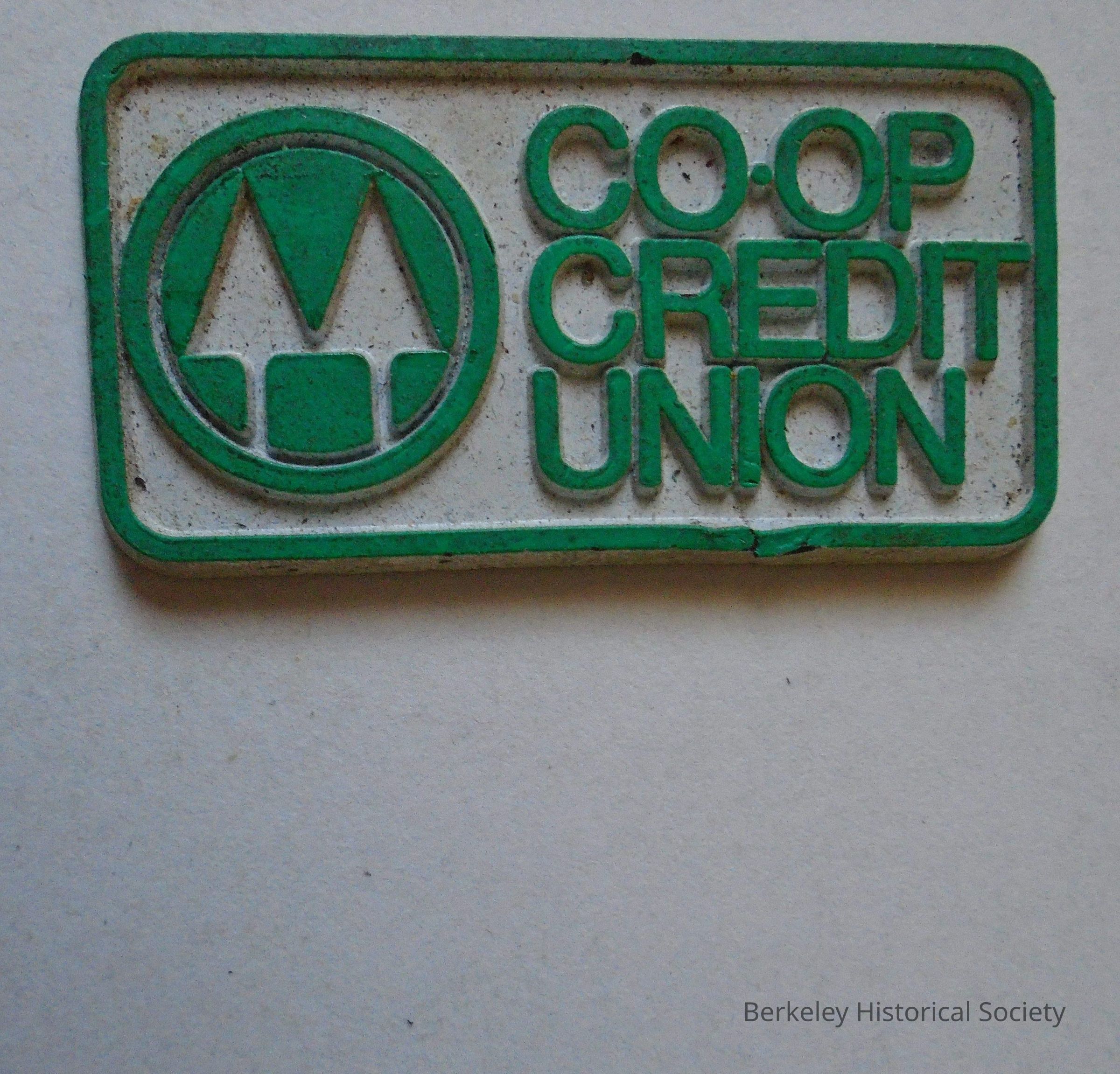 Co-op Credit Union plastic magnet with green and white logo of 2 trees in a circle.