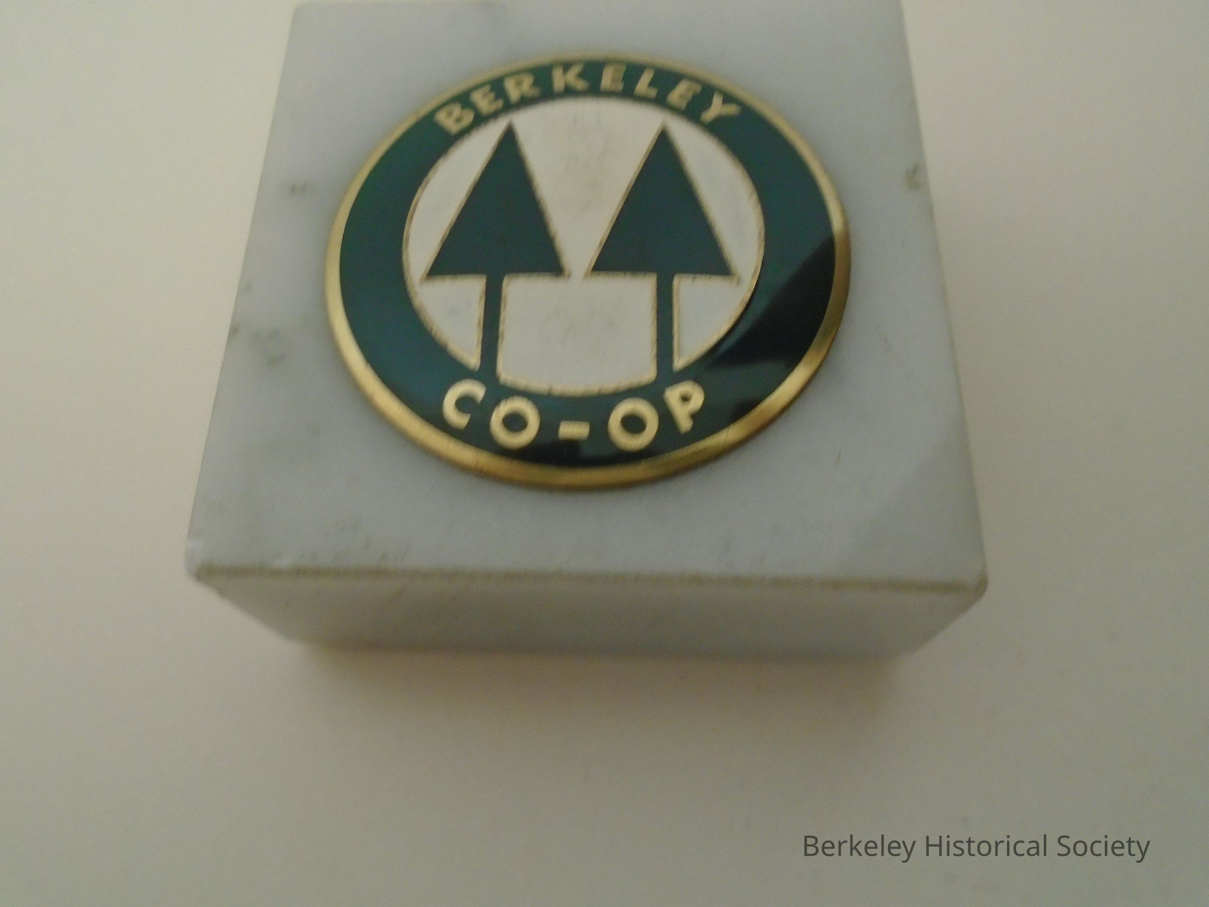 Square marble (grey cabrara) paperweight with circular metal Co-op green and white logo on top: 2 trees with "Berkeley Co-op". Cork on bottom.