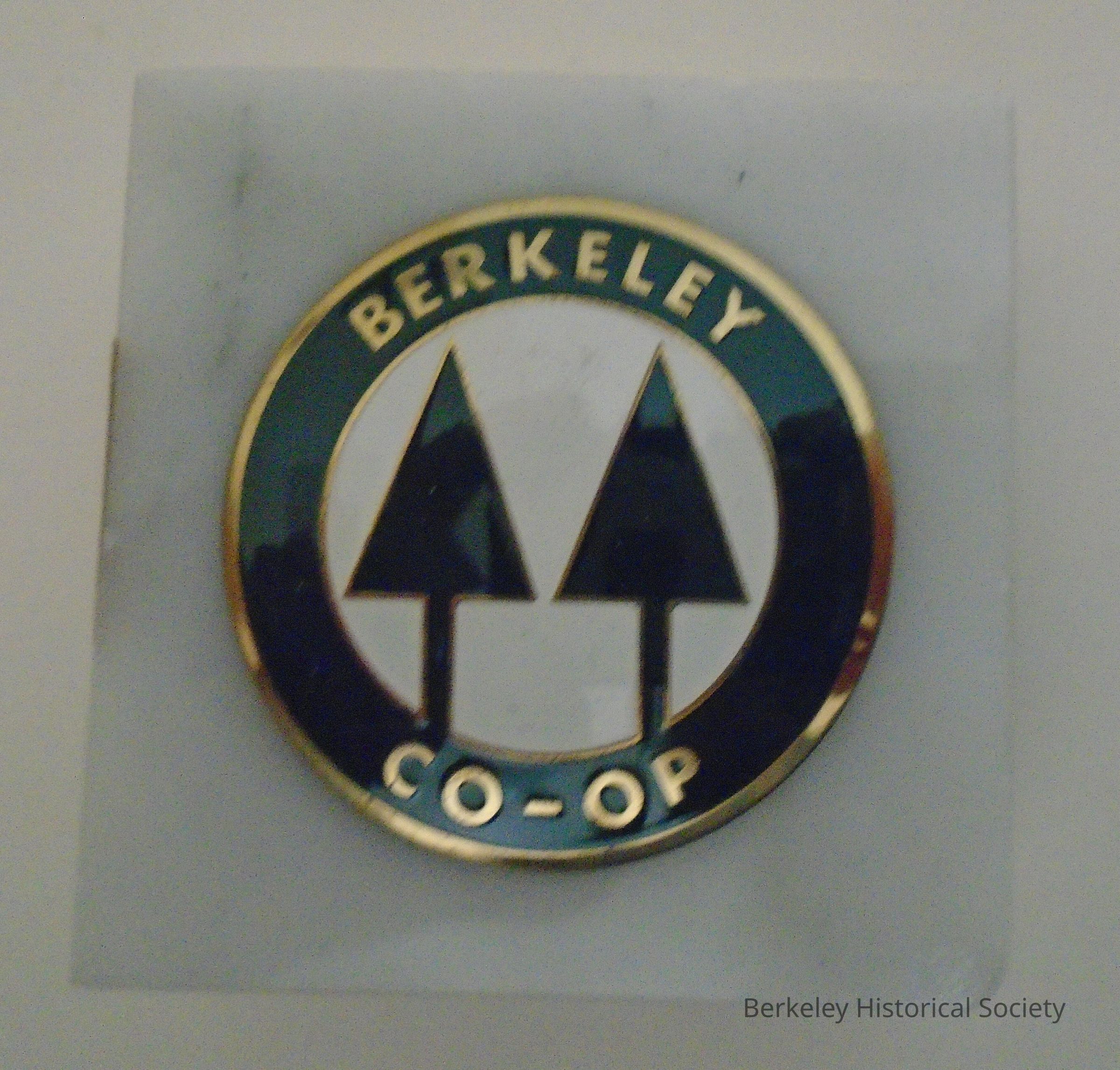 Square marble (grey cabrara) paperweight with circular metal Co-op green and white logo on top: 2 trees with "Berkeley Co-op". Cork on bottom. Sticker on it says Made in italy.