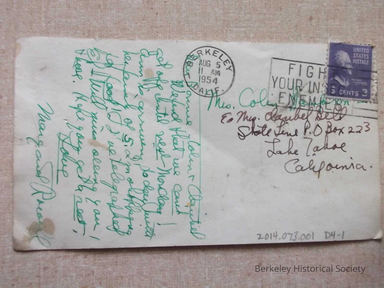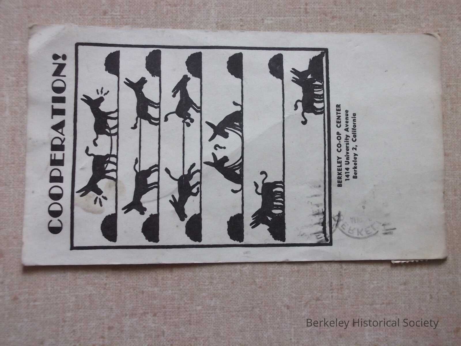 Black and white paper postcard : "Berkeley Co-op Center, 1414 University Avenue, Berkeley 2, California." At top "COOPERATION!" and underneath drawings of 2 donkeys pulling in opposite direction. Note on back and sent to Lake Tahoe, postmarked Aug 5, 1954, Berkeley 2, Calif.Lexicon