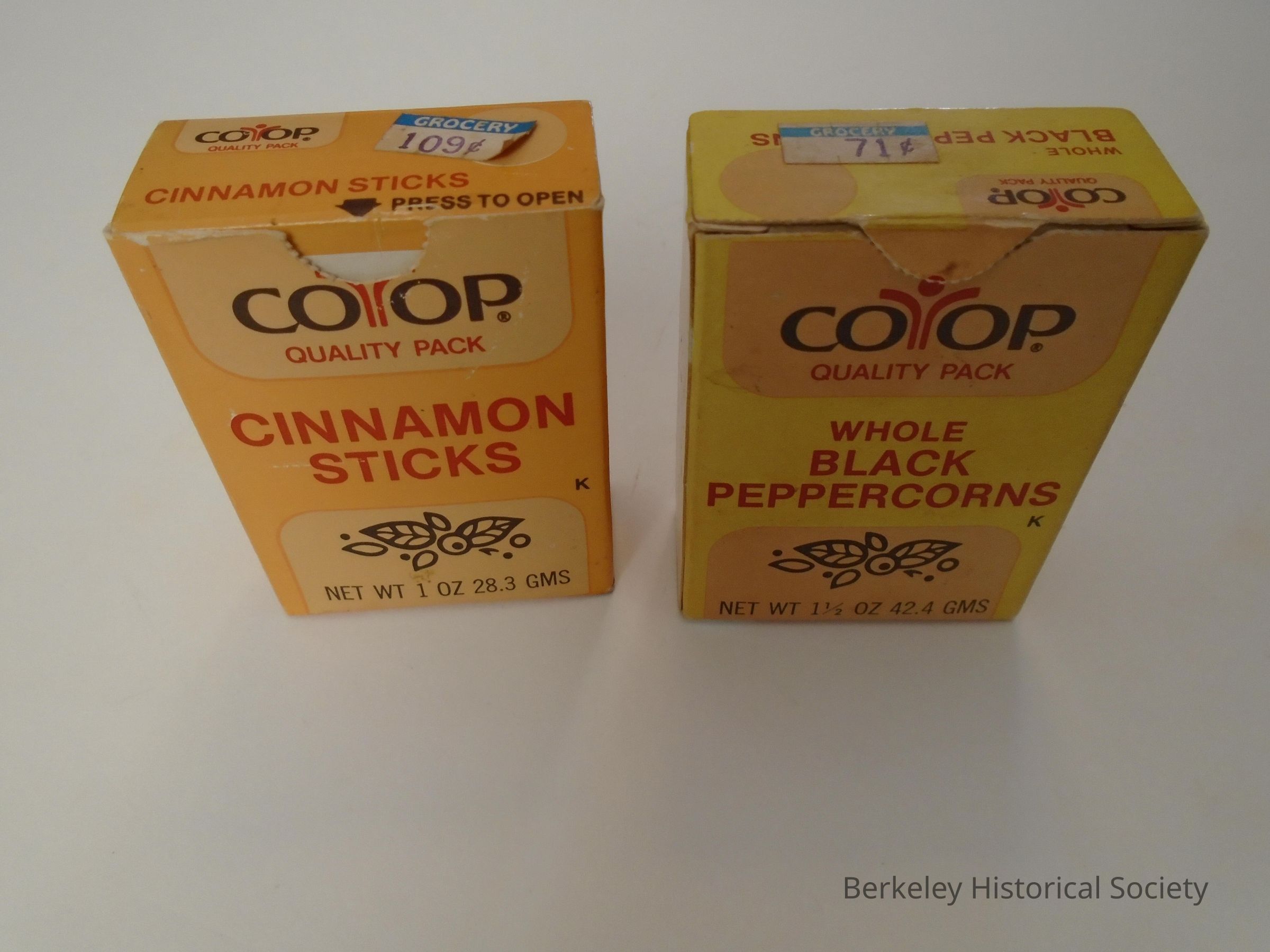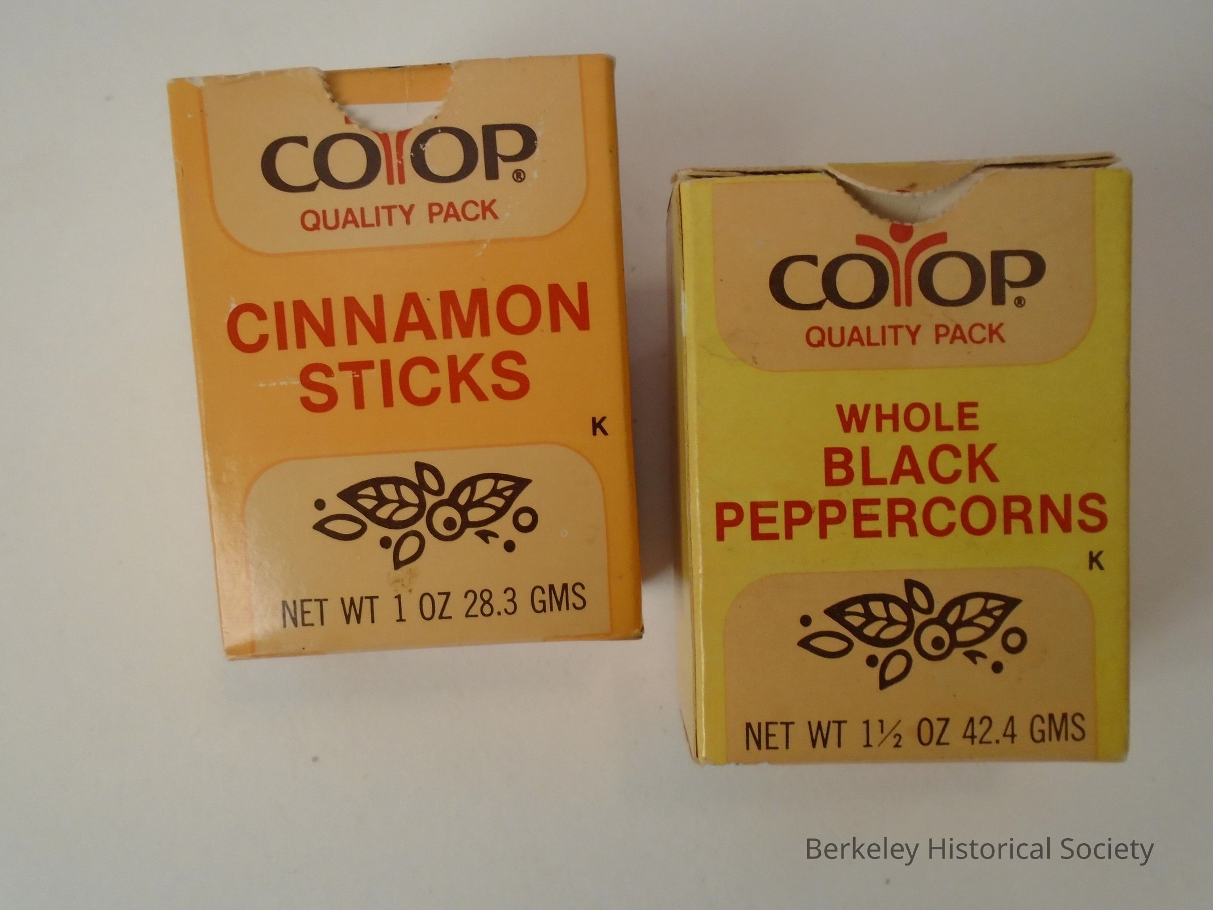 2 yellow cardboard spice boxes, Co-op brand (shows logo). Thin Cardboard in gold, yellow and beige with red and brown/black print. Includes SPC barcode. Newer design box. Cinnamon sticks: 1 oz 28.3 gms and whole black peppercorns: 1 1/2 oz 42.4 gms.Lexicon