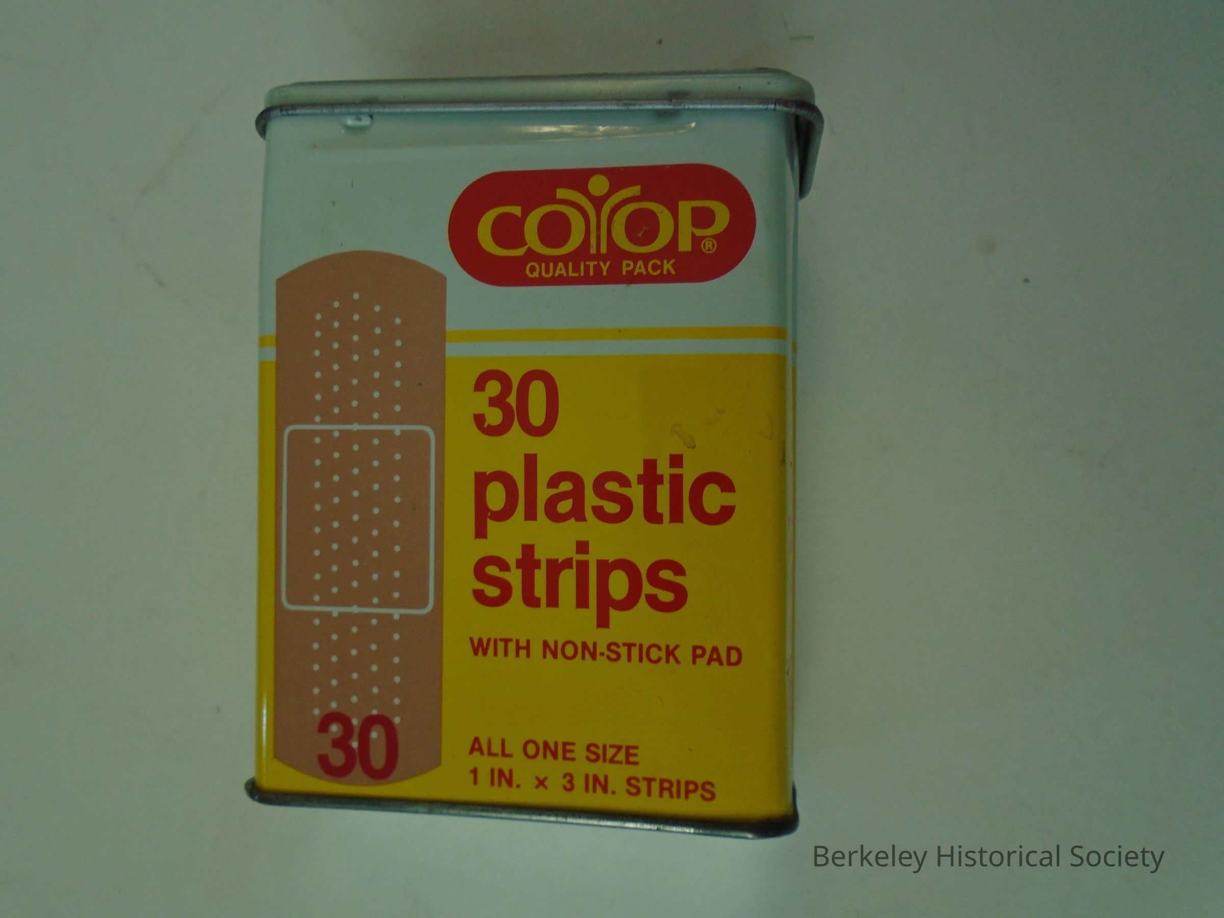 White, red and yellow Co-op metal tin for 30 plastic strips/band aids. (Container is empty). Co-op Quality Pack brand. Sticker price $1.43. Hinged lid on top. Dent on side.Made/Created
