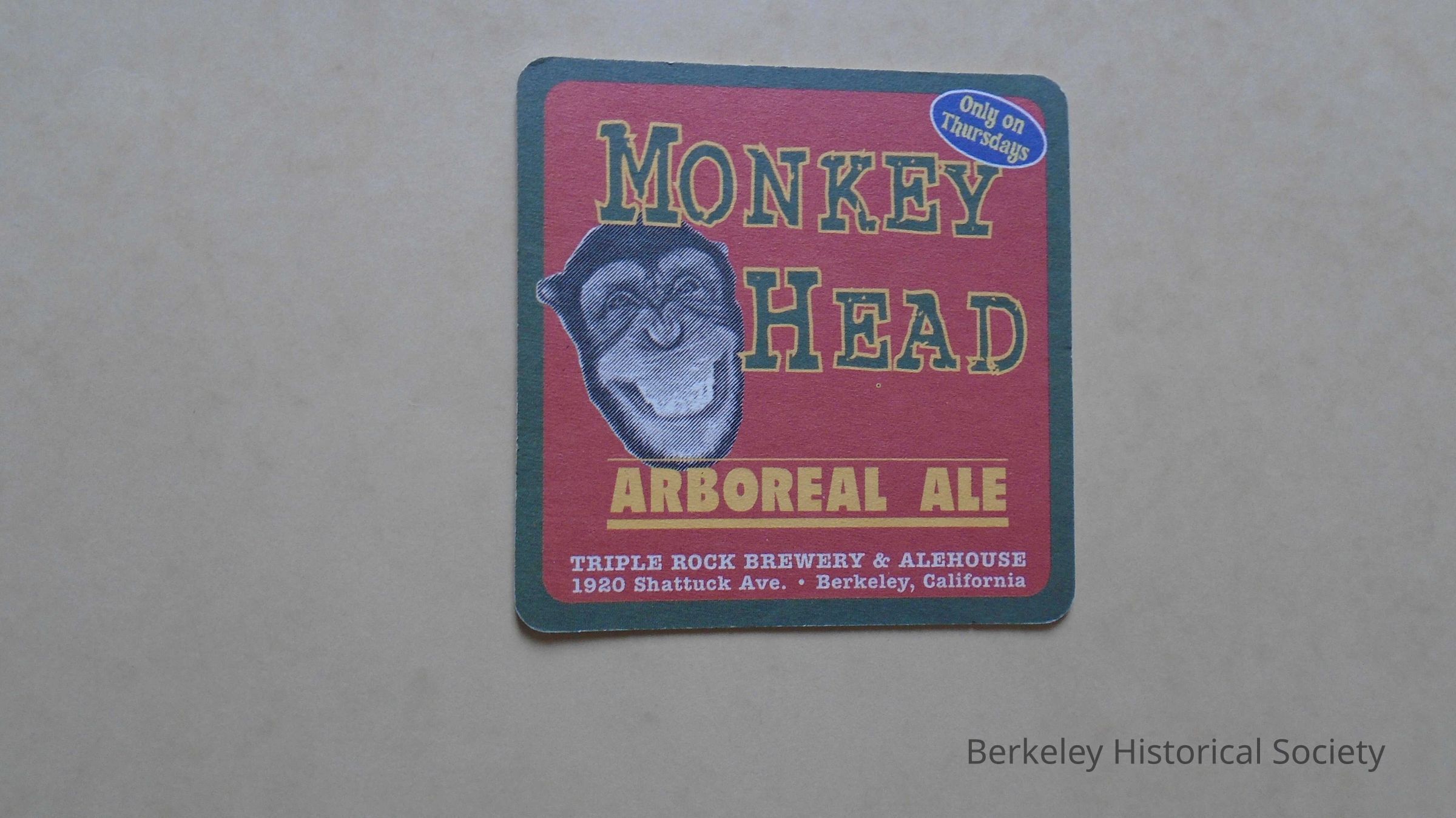 Square, red & green paper coaster from Triple Rock Brewery & Alehouse 1920 Shattuck Ave. Berkeley. "Monkey Head Arboreal Ale" printed on it with a picture of a smiling monkey. "Only on Thursdays".