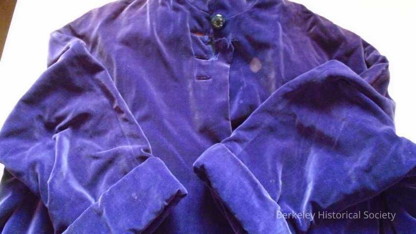 Purple velvet coat. High neck, 4 buttons (3 missing) at top. Loose sleeves with cuffs, 2 slit pockets, flared body.