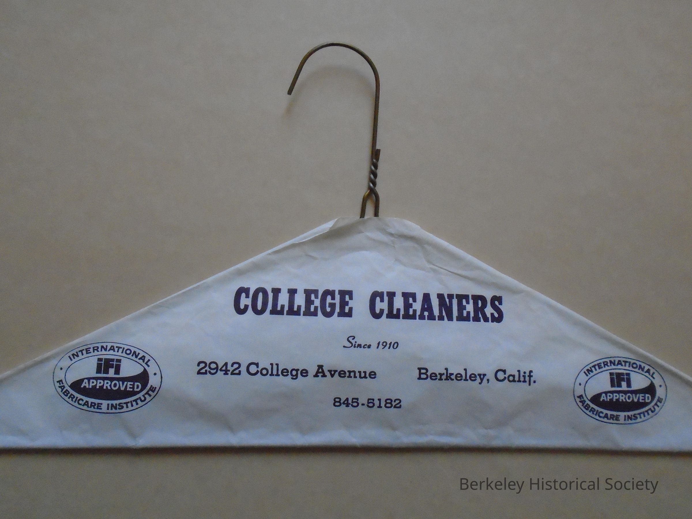 Wire coat hanger with paper cover over all but hook. White paper with blue/black printing on both sides: COLLEGE CLEANERS, Since 1910, 2942 College Avenue, Berkeley, Calif., 845-5182. Logo of International Fabricare Institute/Approved on each end. See duplicate 1978.002.091.