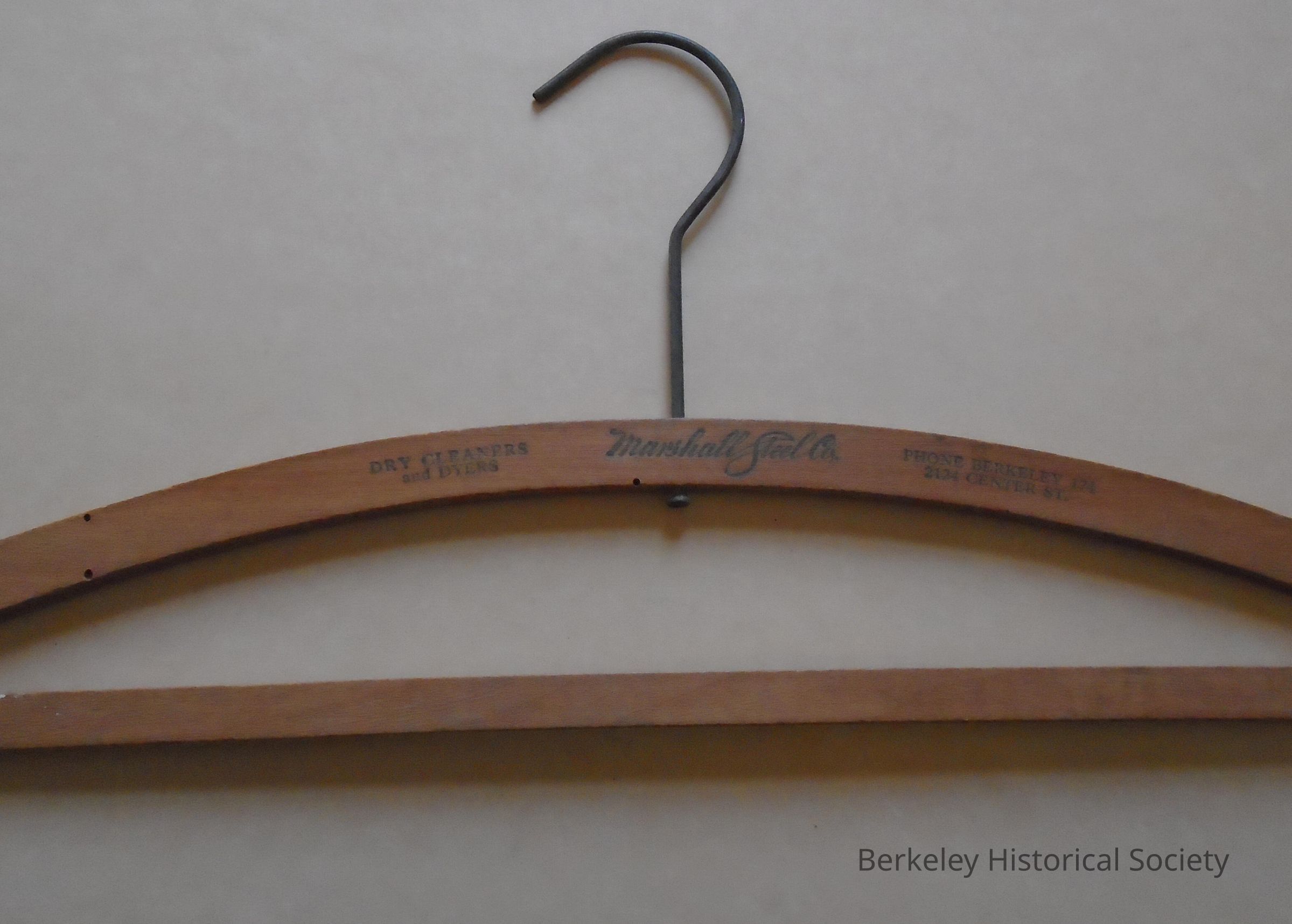 Wooden coat hanger with wire hook from "Marshall Steel Co. Dry Cleaners and Dyers". Wood part is composed of a curving shoulder piece and a straight brace across the bottom. Stamped "Phone BERKELEY 174" and ''2124 Center ST." Found in 2355 Stuart St. in 1974.