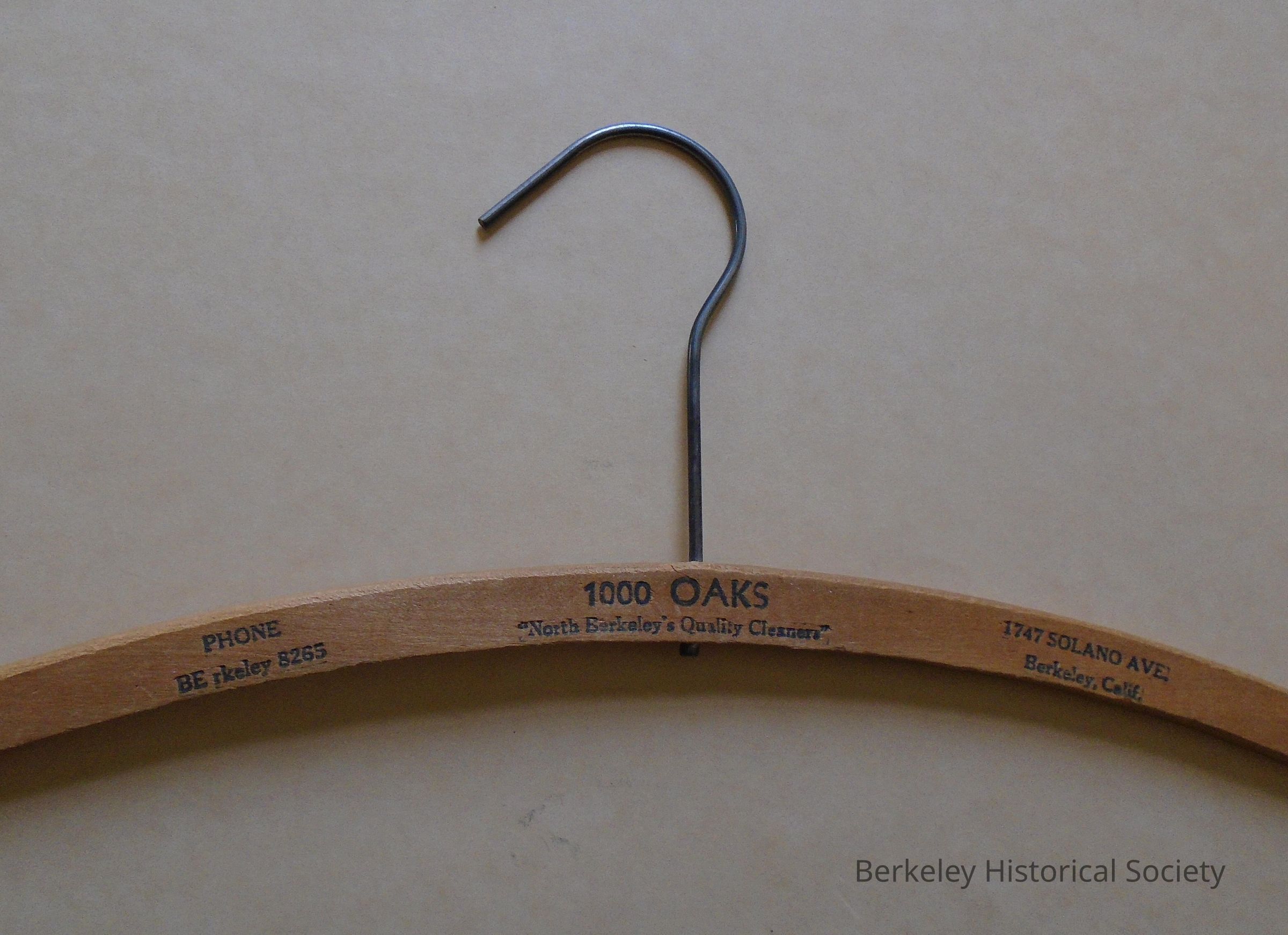 Wooden coat hanger with wire hook, stamped "1000 OAKS", North Berkeley's Quality Cleaners. Phone BErkeley 8265, 1747 Solano Ave., Berkeley, Calif." Wood part is composed of a curving shoulder piece.