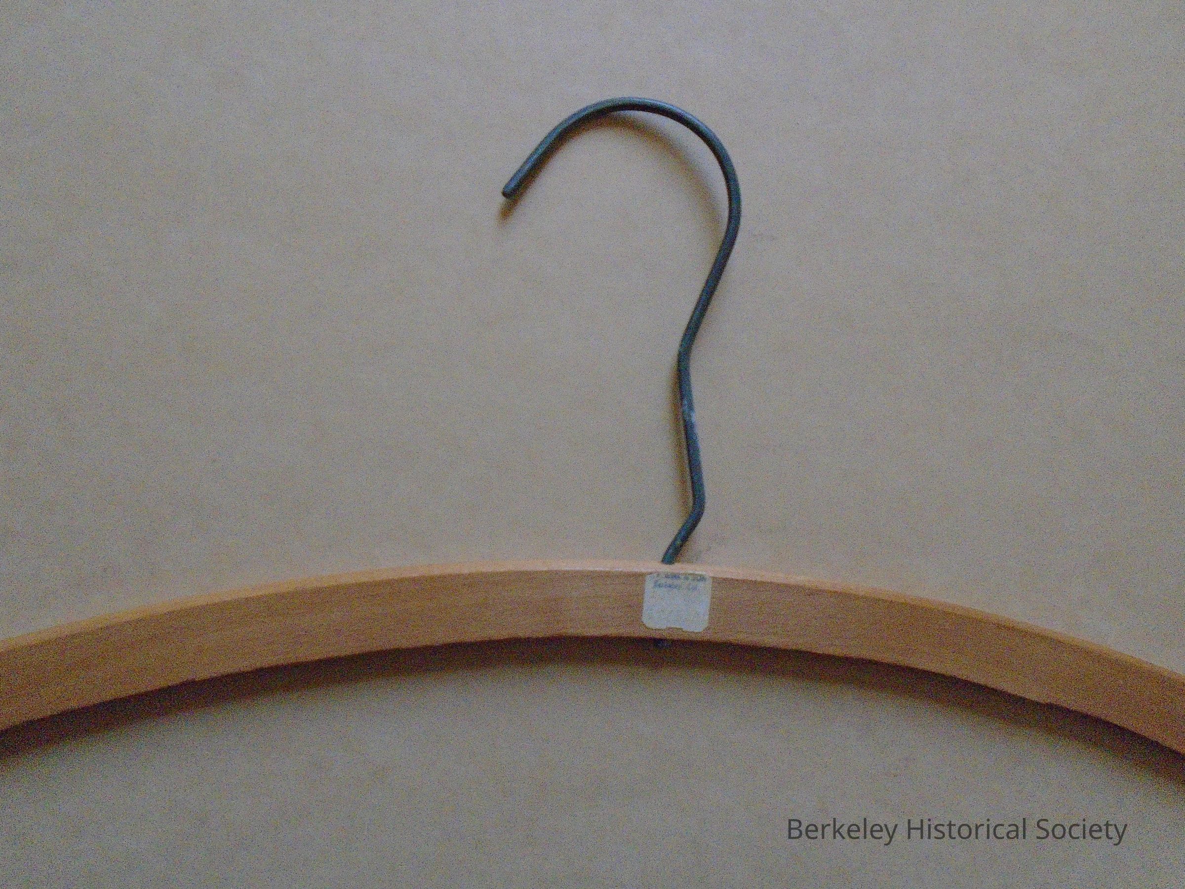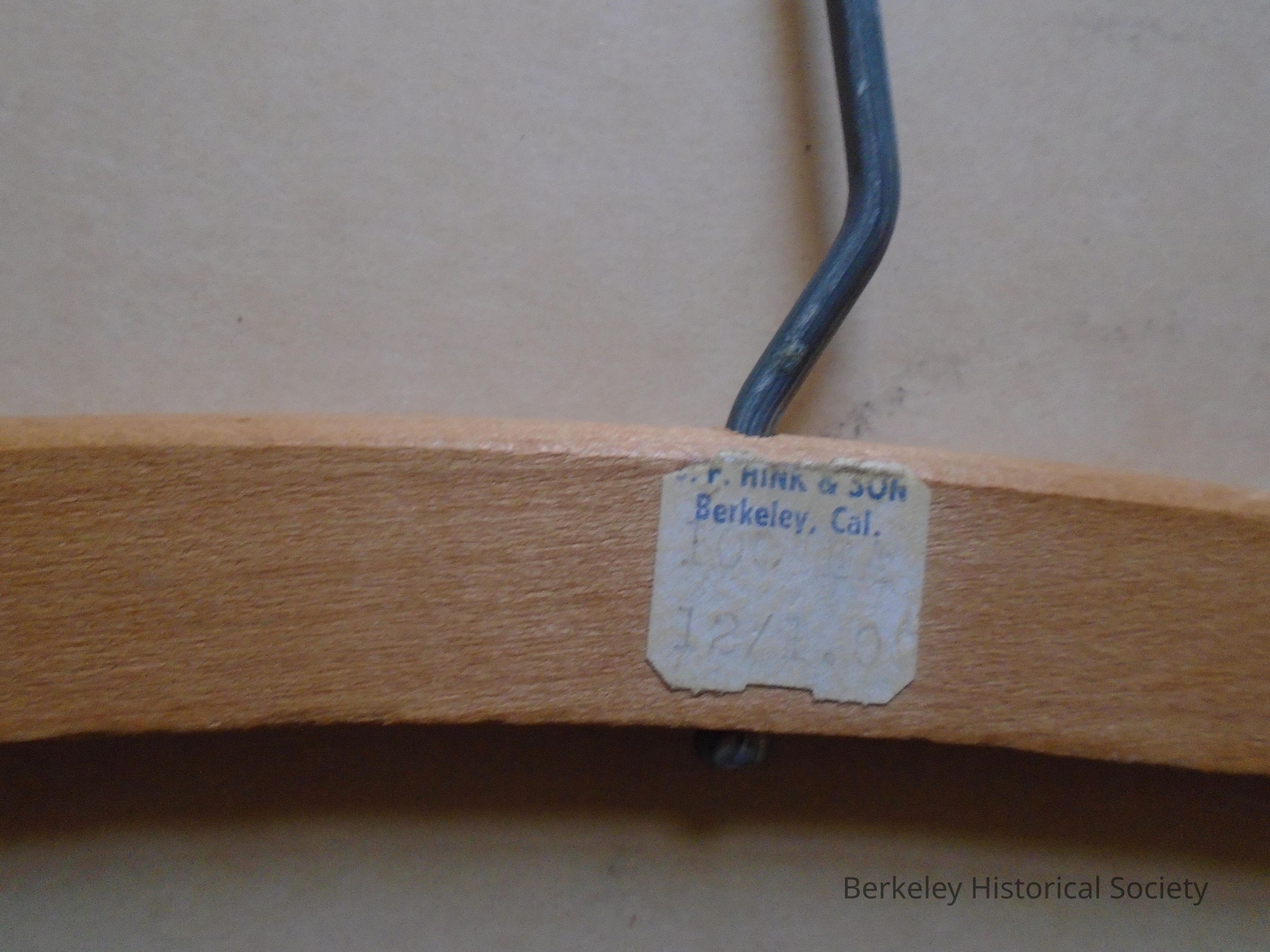 Plain wood coat hanger with metal hook, nothing printed on it. Price sticker shows "J.F. Hink & Sons, Berkeley, Cal. 12/$1.00."