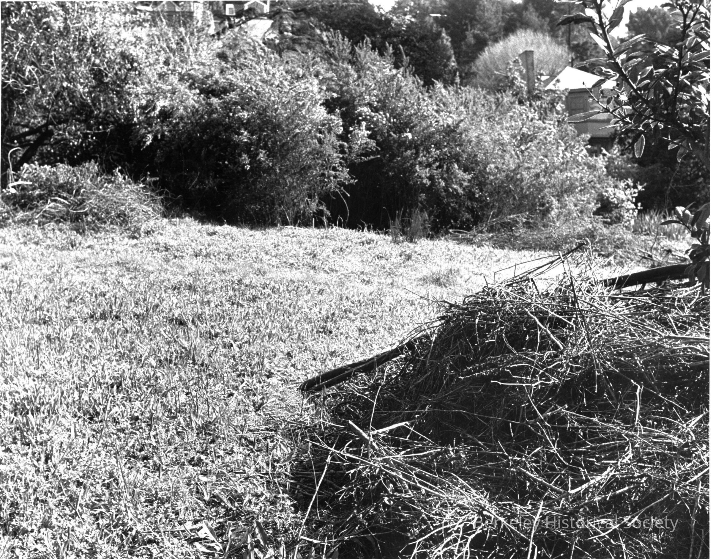 Small area of park overgrown with bushes and piles of trimmed growth.Other Names and Numbers