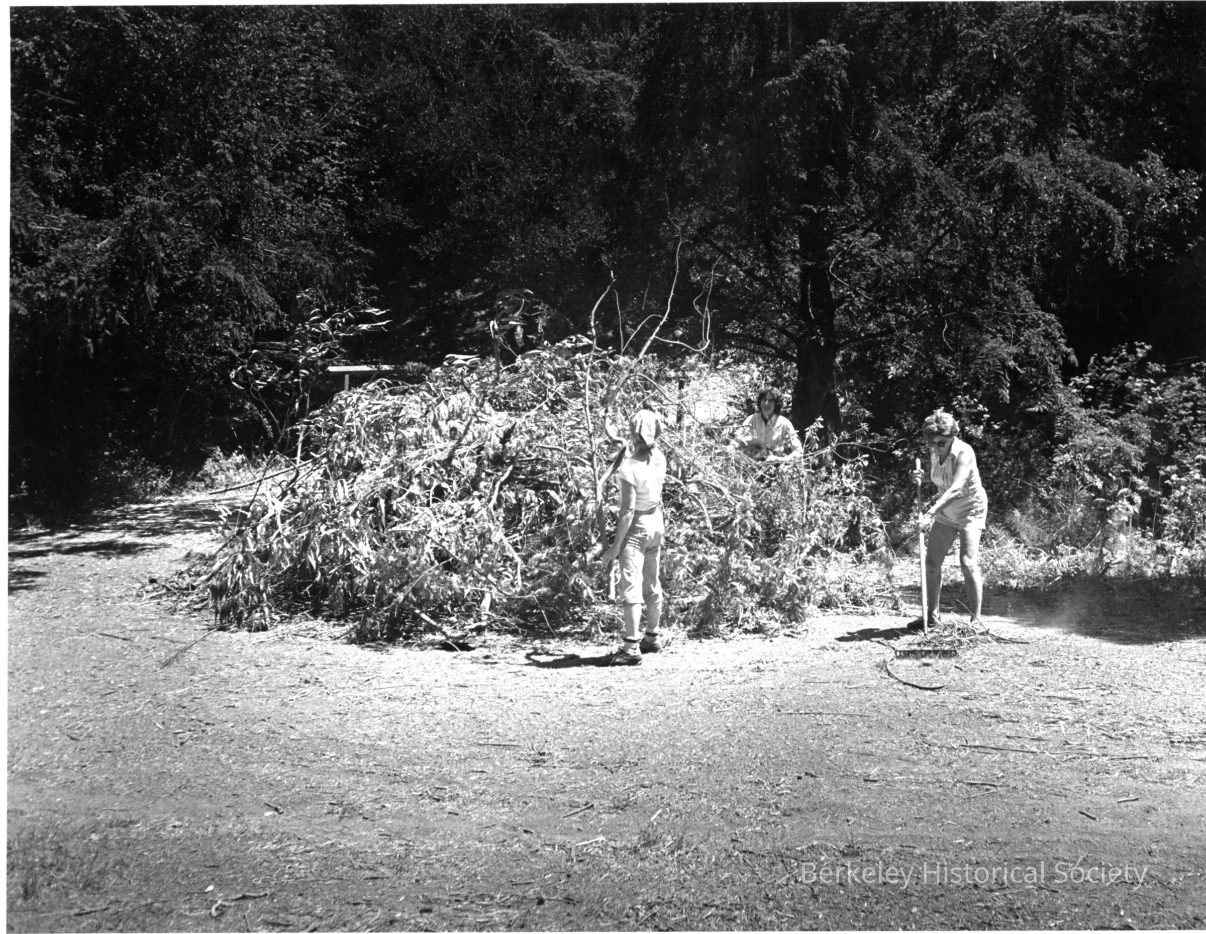 Jean Plank, Arlene Goldfarb, and Addie Collins working on a large pile of branches in Codornices ParkLexicon