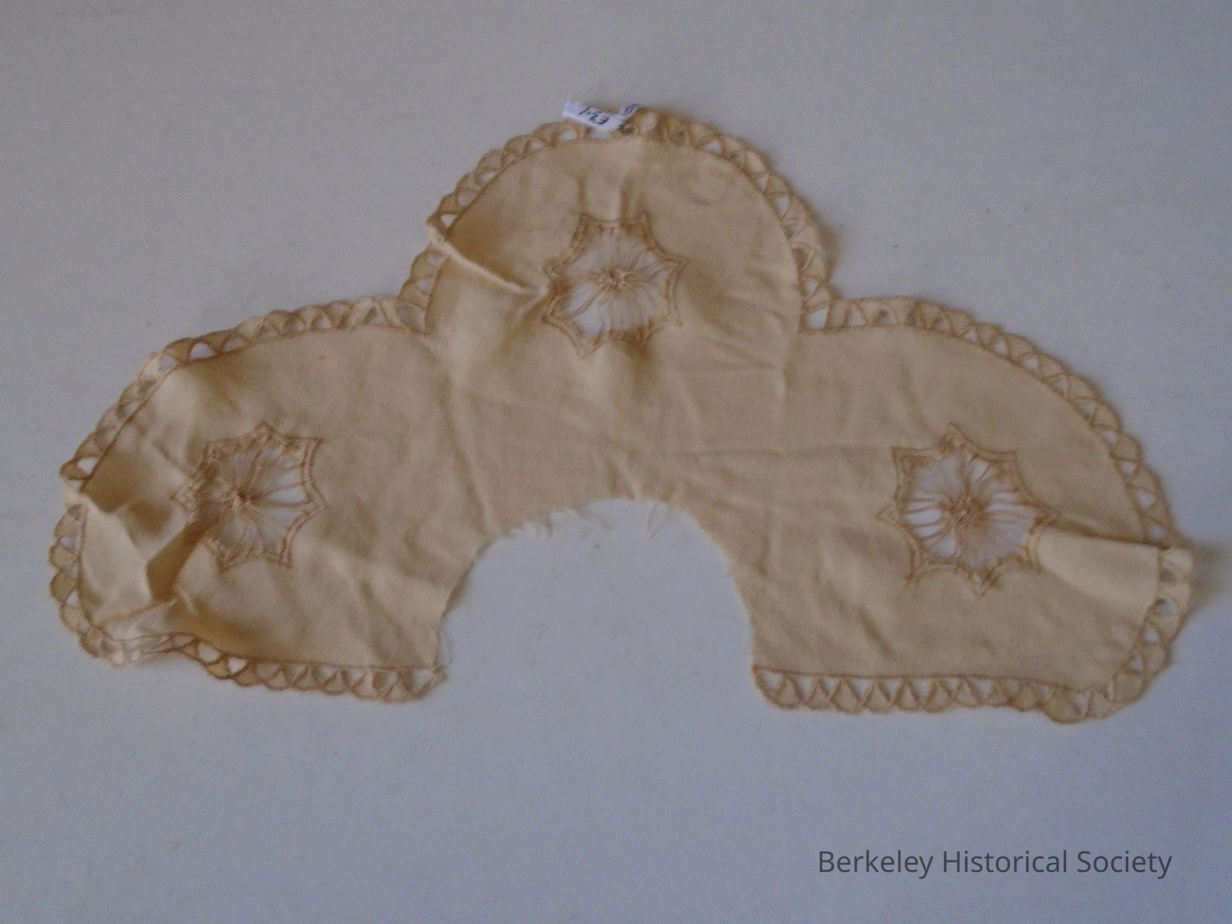 Silk embroidered cutwork collar, natural color. Plain silk material with 3 circular embroideries in 3 scallops...more in the shape of a half collar. Embroidered around outer edge of collar in small triangles. Inside edge is cut but not seamed. From the Margot Guinn estate.