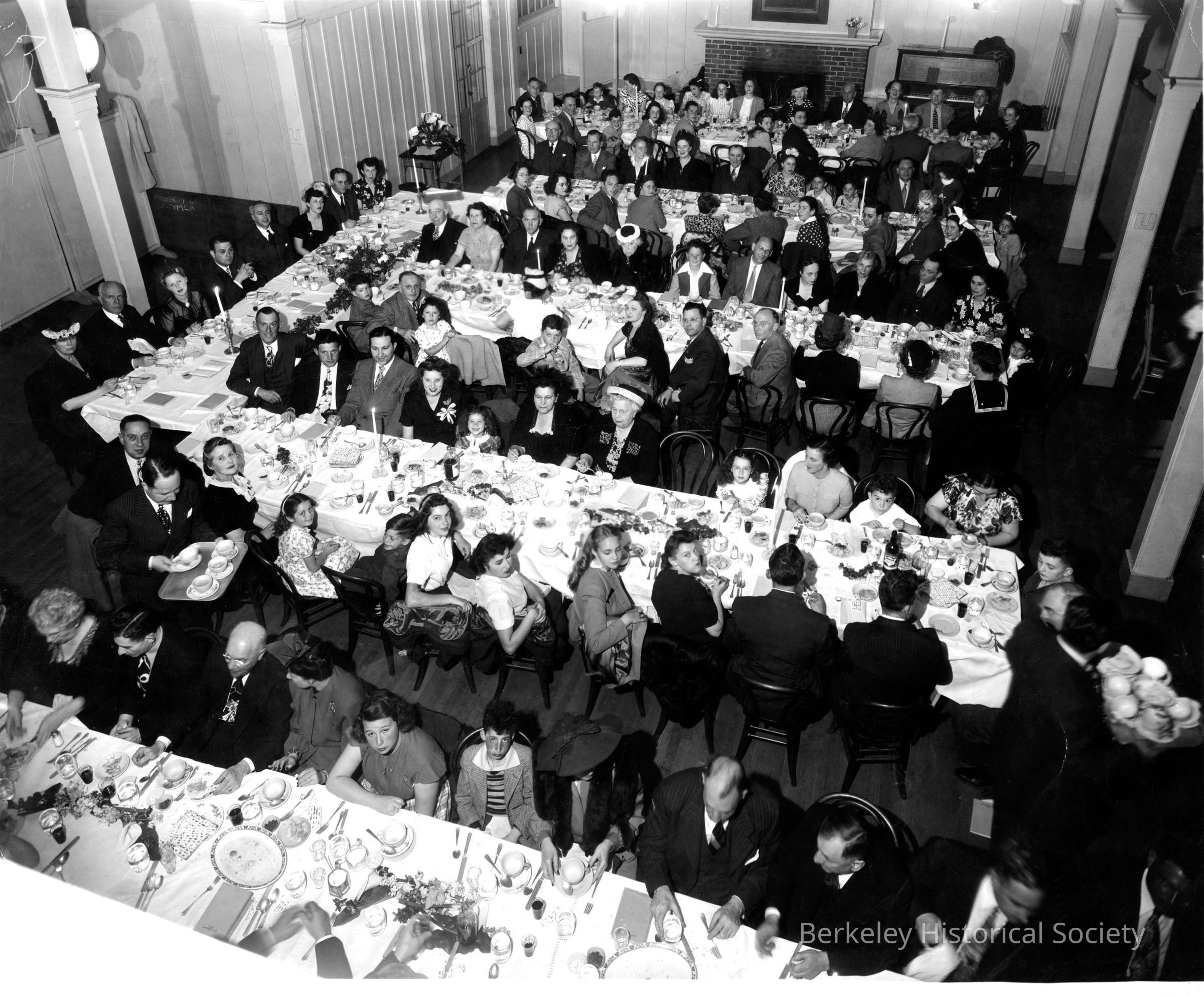 Passover Seder, 1946. Possibly at Berkeley YNCA or at Whitecotton Hotel. Rabbi Joseph Giten and wife Rosalie at head table, with synagogues first President Billiam Blackfield and wife Cecilia, and Vice President Harold Edelstein and wife Marian.Other Names and Numbers