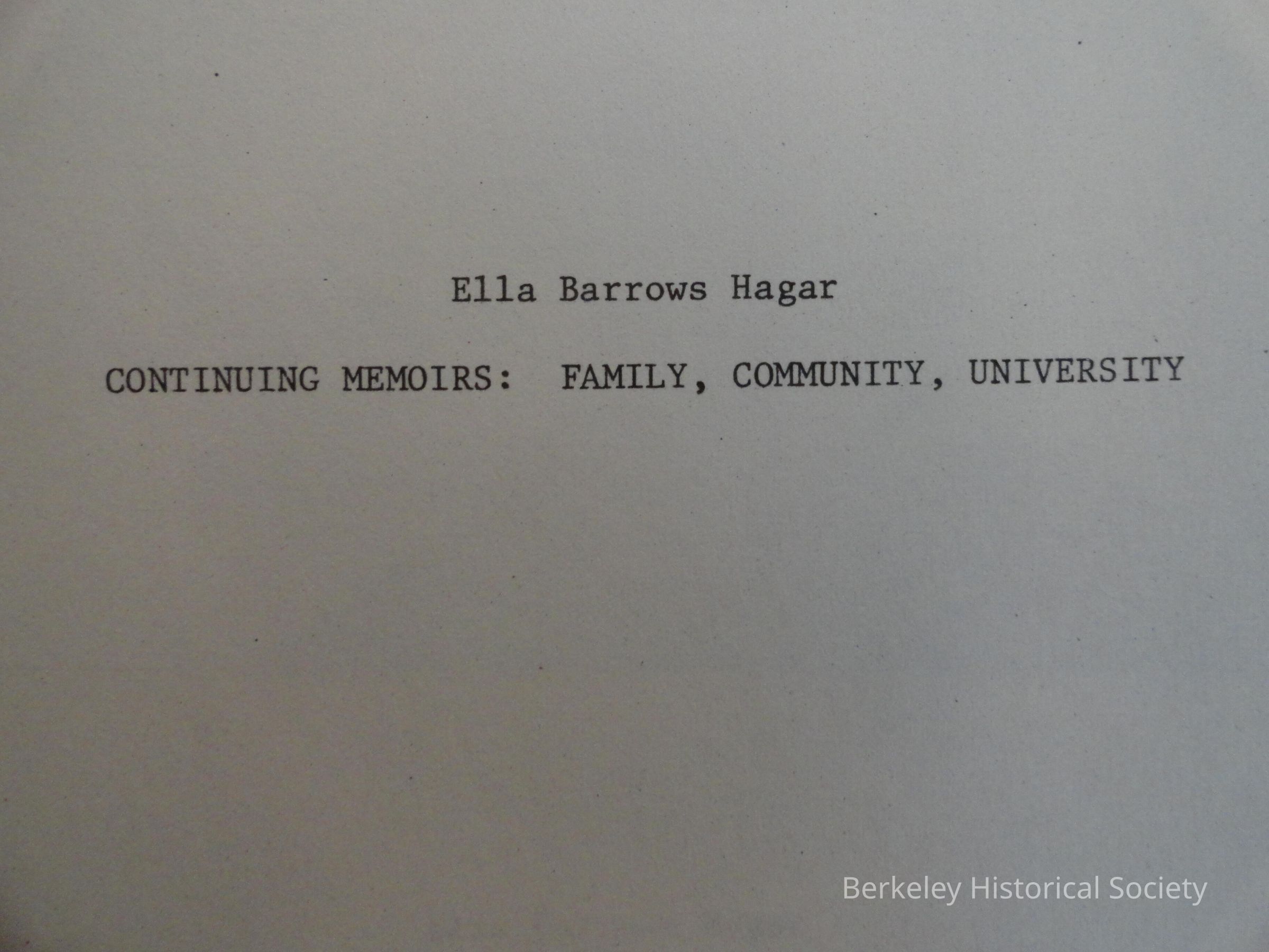 Reminiscences of childhood in the Philippines; her father, David Prescott Barrows; schooling in Berkeley; student days at the University of California, 1915-1919; living in the president's home on campus; social life and friends in Berkeley; marriage to Gerald H. Hagar and role as regent's wife; association with YWCA; service with various organizations, committees and alumni groups; family life; travels. Photographs and documentary material inserted.
