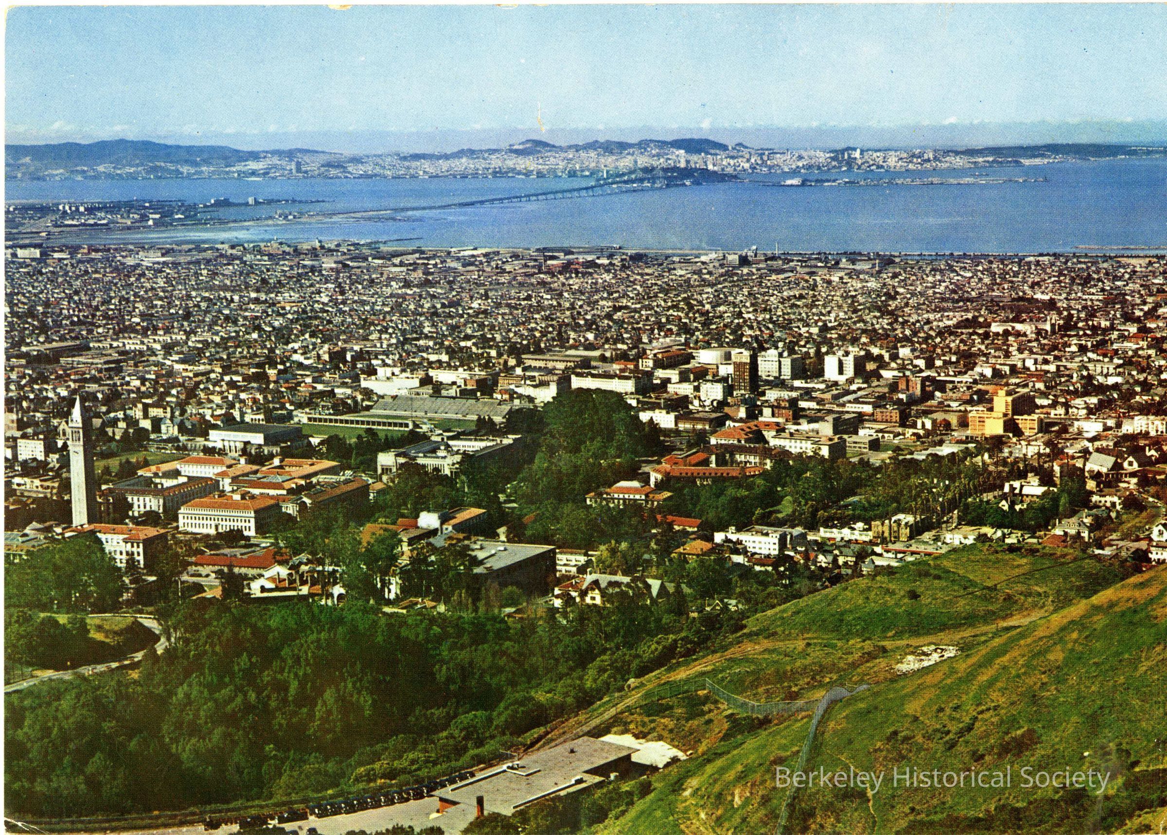 Two postcards with aerial color photograph of Berkeley that advertises the Berkeley Chamber of Commerce's Convention and Tourist Bureau. View from hills, with San Francisco in the distance.