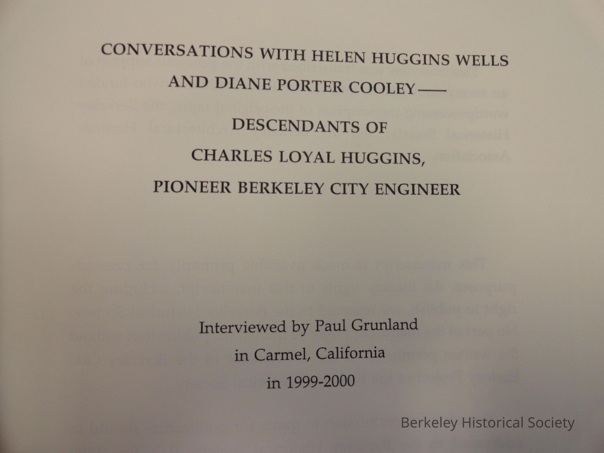 Conversations with Helen Huggins Wells, and Diane Porter Cooley: descendents of Charles Loyal Huggins, pioneer Berkeley city engineer.Entry/Object ID