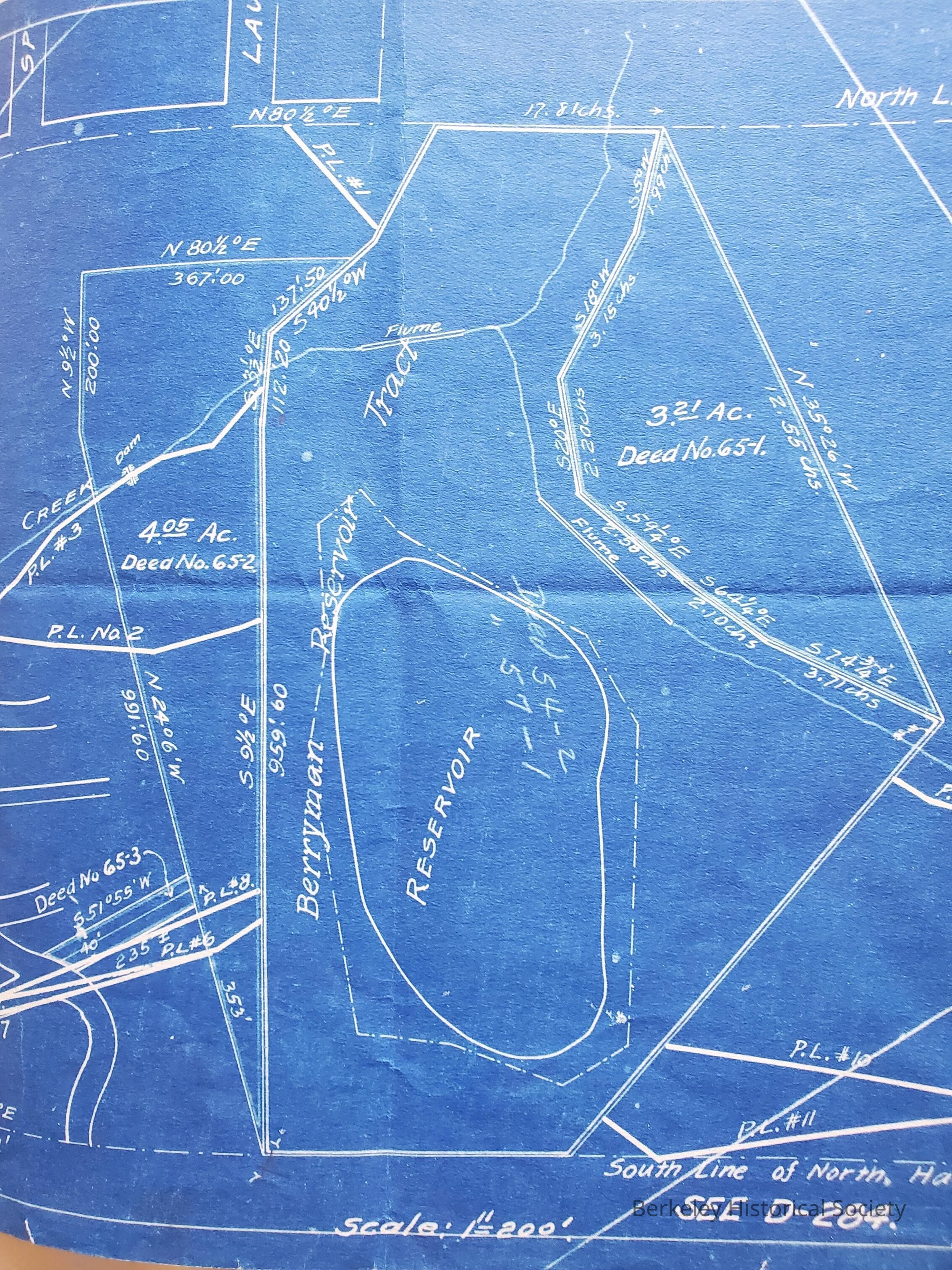 Printed description of property. In front blueprint map of Berryman Reservoir Tract.