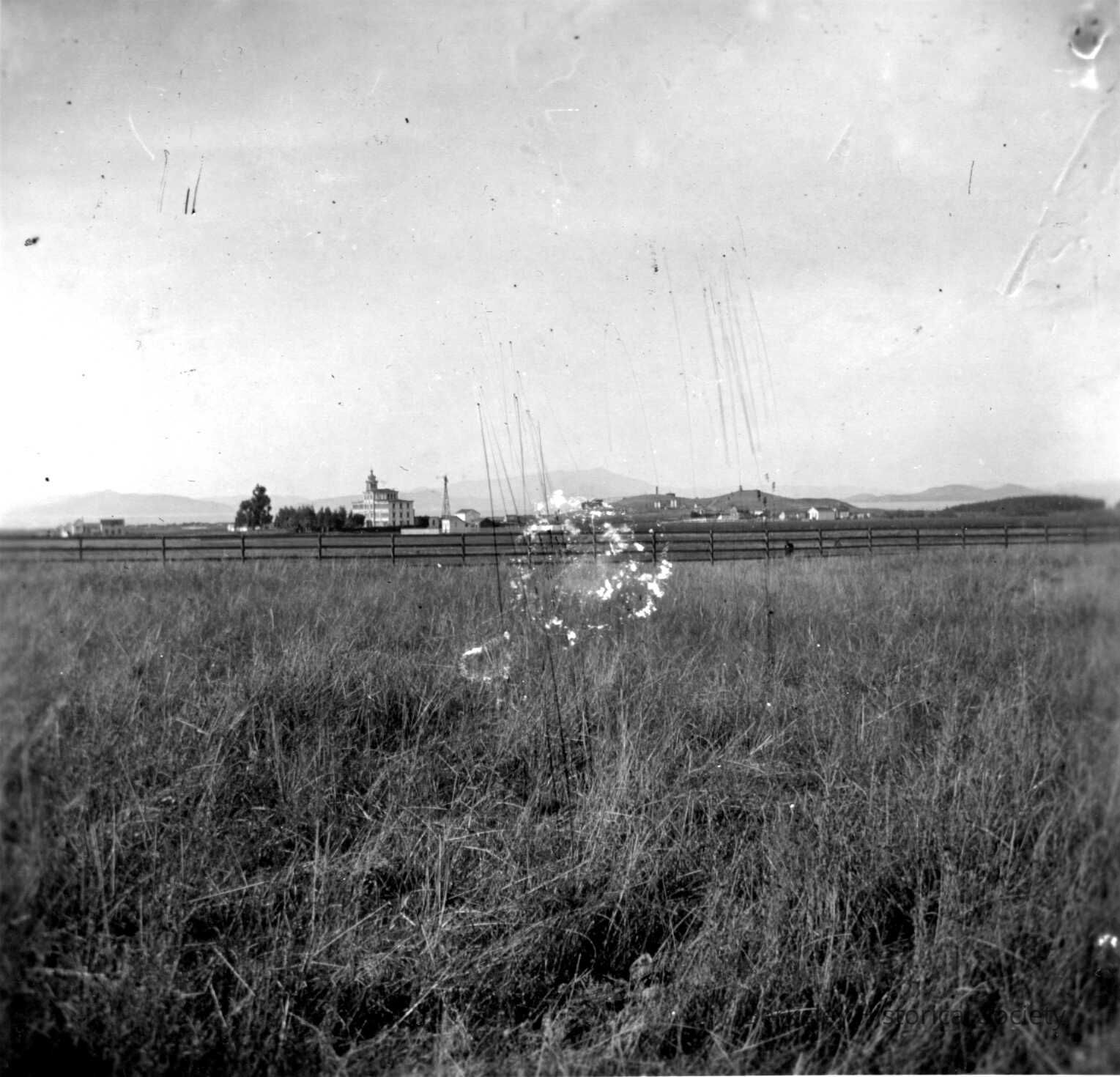 Looking across empty fields, building of Cornell Watch Factory in distance, on Gilman Street