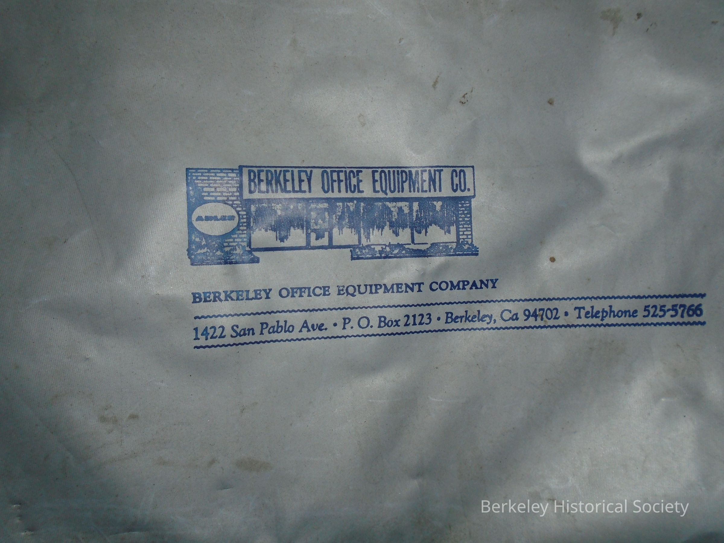 Gray plastic cover for office equipment, probably typewriter. Advertising Berkeley Office Equipment Co. , 1422 San Pablo Ave, PO Box 2123, Berkeley, CA. 94702, Telephone 525-5766. See also 1978.002.322.Dimensions