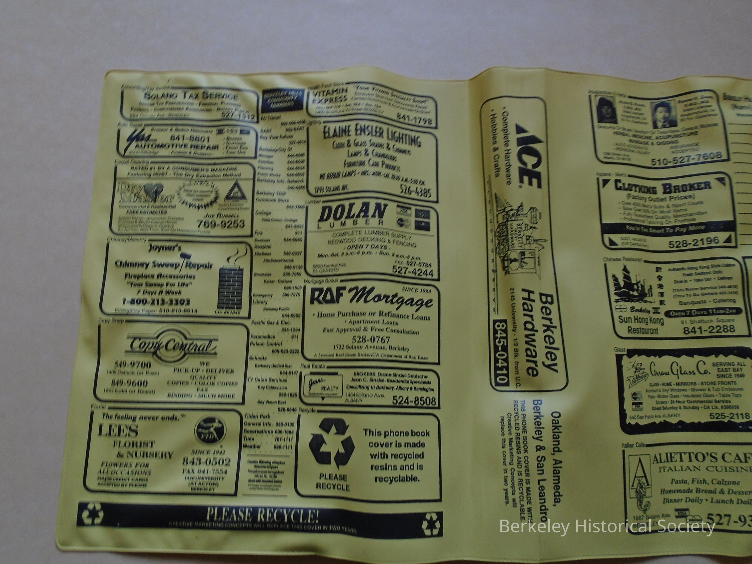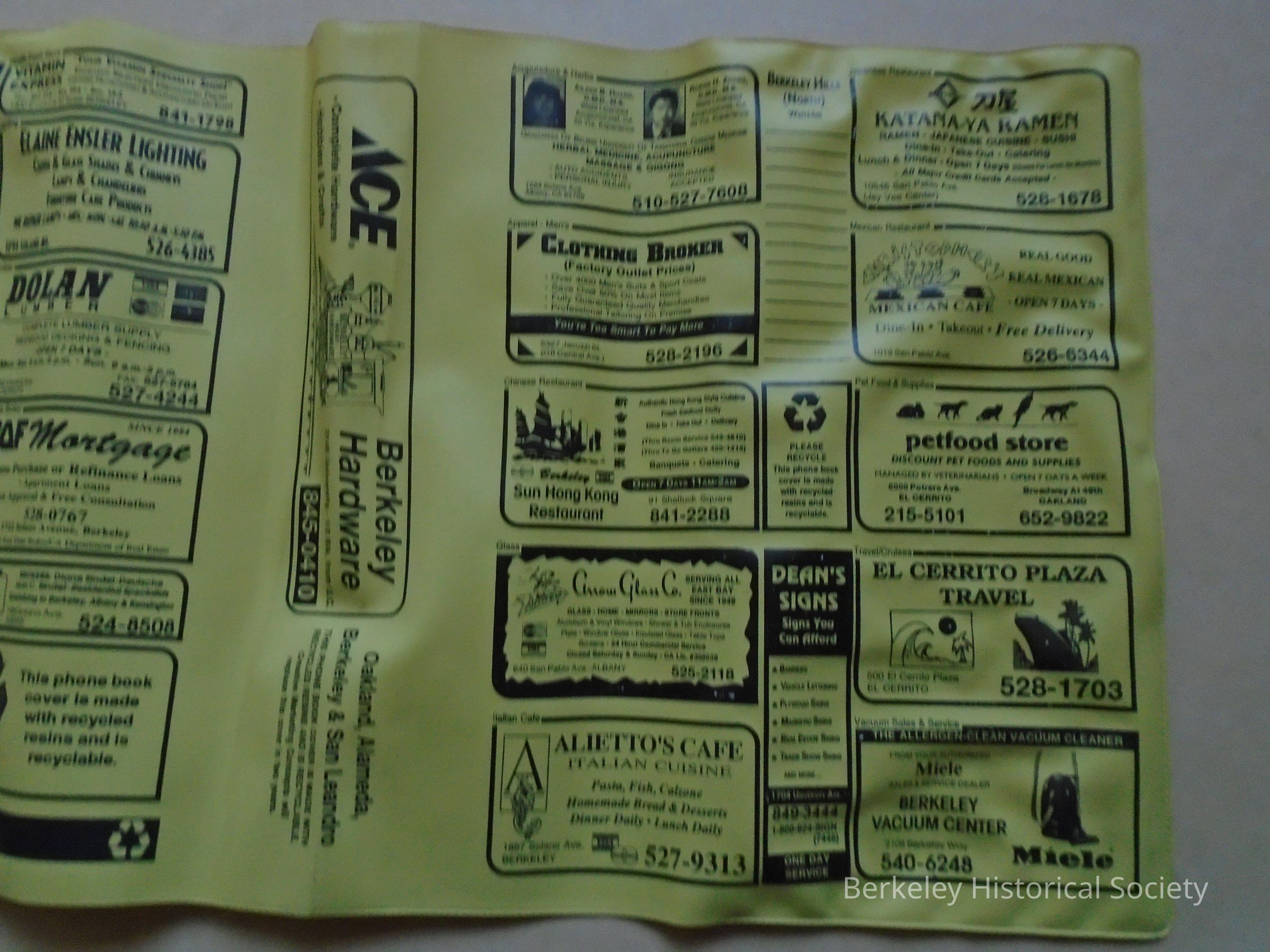Yellow plastic telephone book cover with local businesses' advertising on it. Plastic is supposedly recyclable . Cover was for Berkeley, Oakland, Albany and El Cerrito phone book.