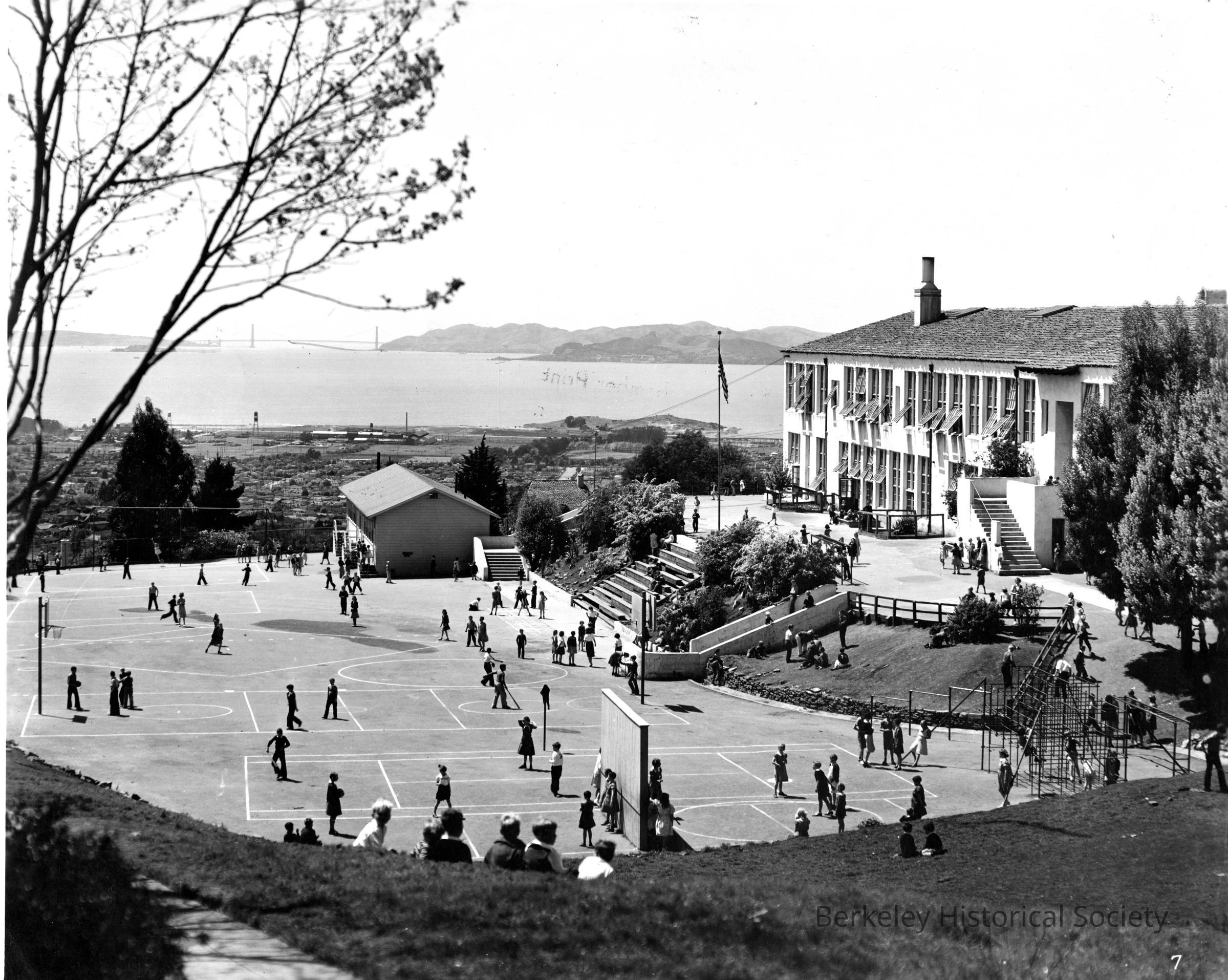 Cragmont School, interior view of playground and building