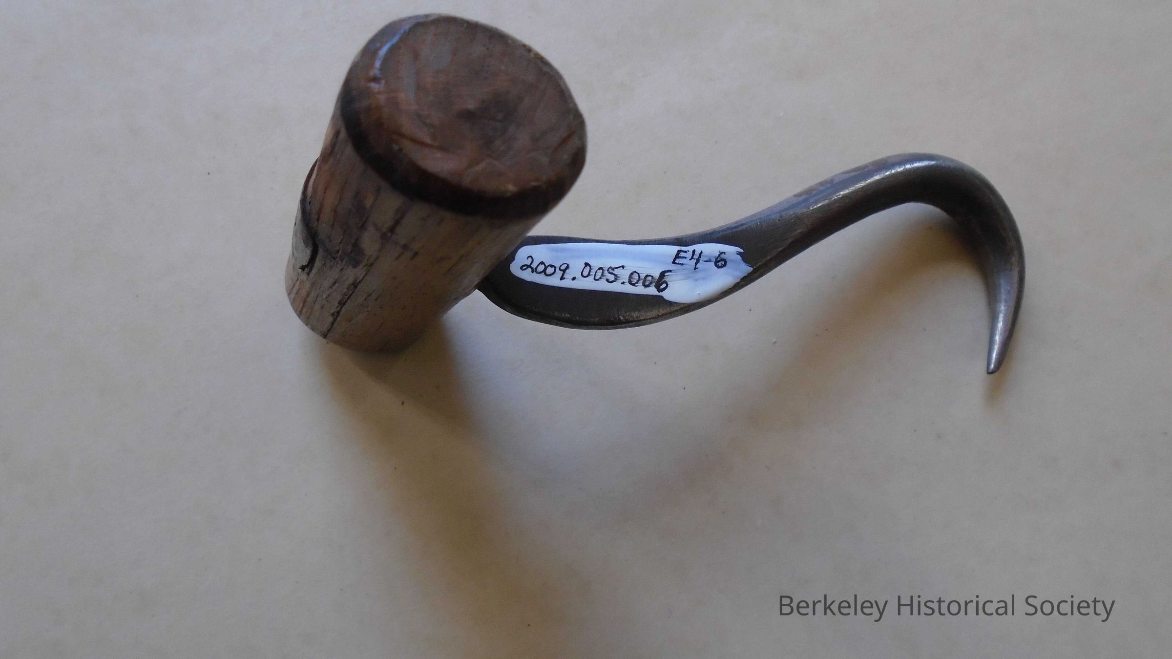 Metal S shaped hook with wood (oak) handle. Hay Crook, hay hook tool. Found in basement of house at 2154 Russell St. in 1970's. May have belonged to a previous tenant , Naylor C. Lee who lived there from 1943-1964 and was a shipfitter.