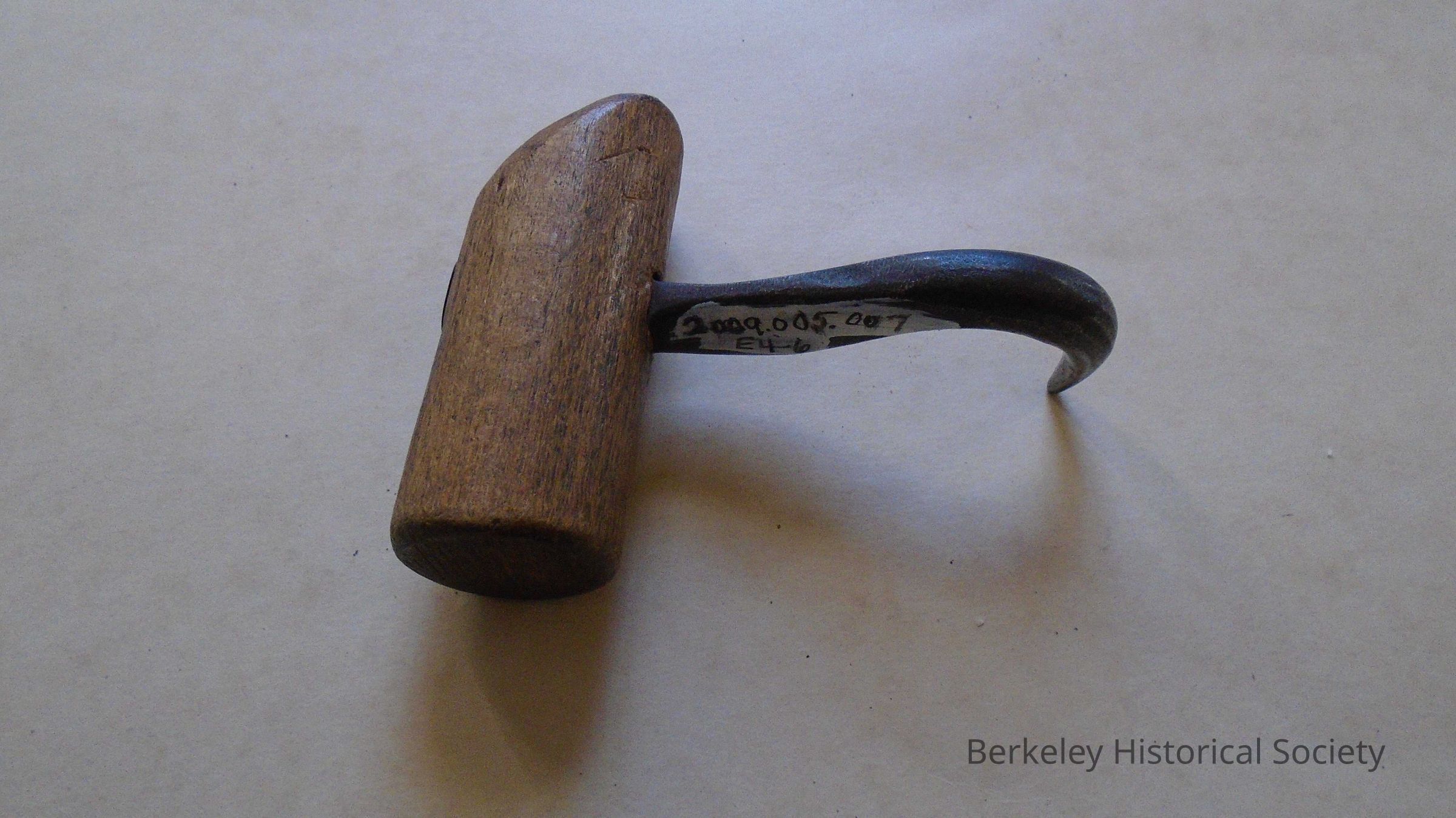 Metal S shaped hook with wood (oak) handle. Hay Crook, hay hook tool. End of handle has a diagonal cut on one end for thumb.