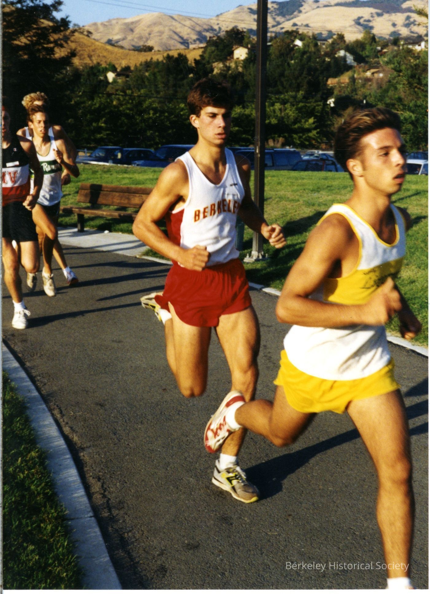 Cross country runner of Berkeley High School. Unidentified runner along with competitors on path with hills in background.Other Names and Numbers