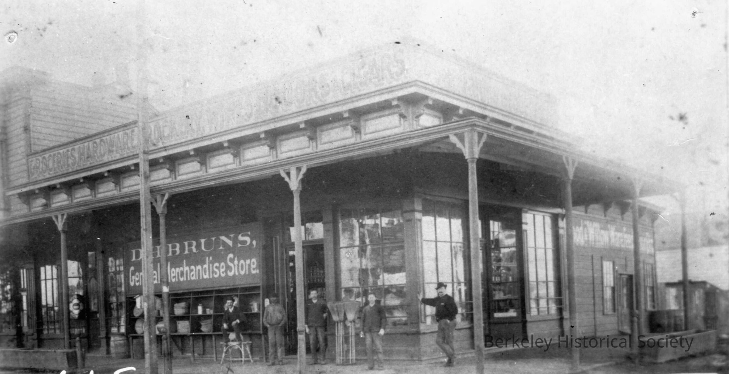 D. H. Bruns General Merchandise Store, 1890's. Southwest corner of San Pablo Avenue and University Avenue. Paul Nickelmann sitting on grindstone, Geo. Fedeeerwitz in doorway next to straw brooms, later became Bay Pharmacy, Pursel owner.Lexicon