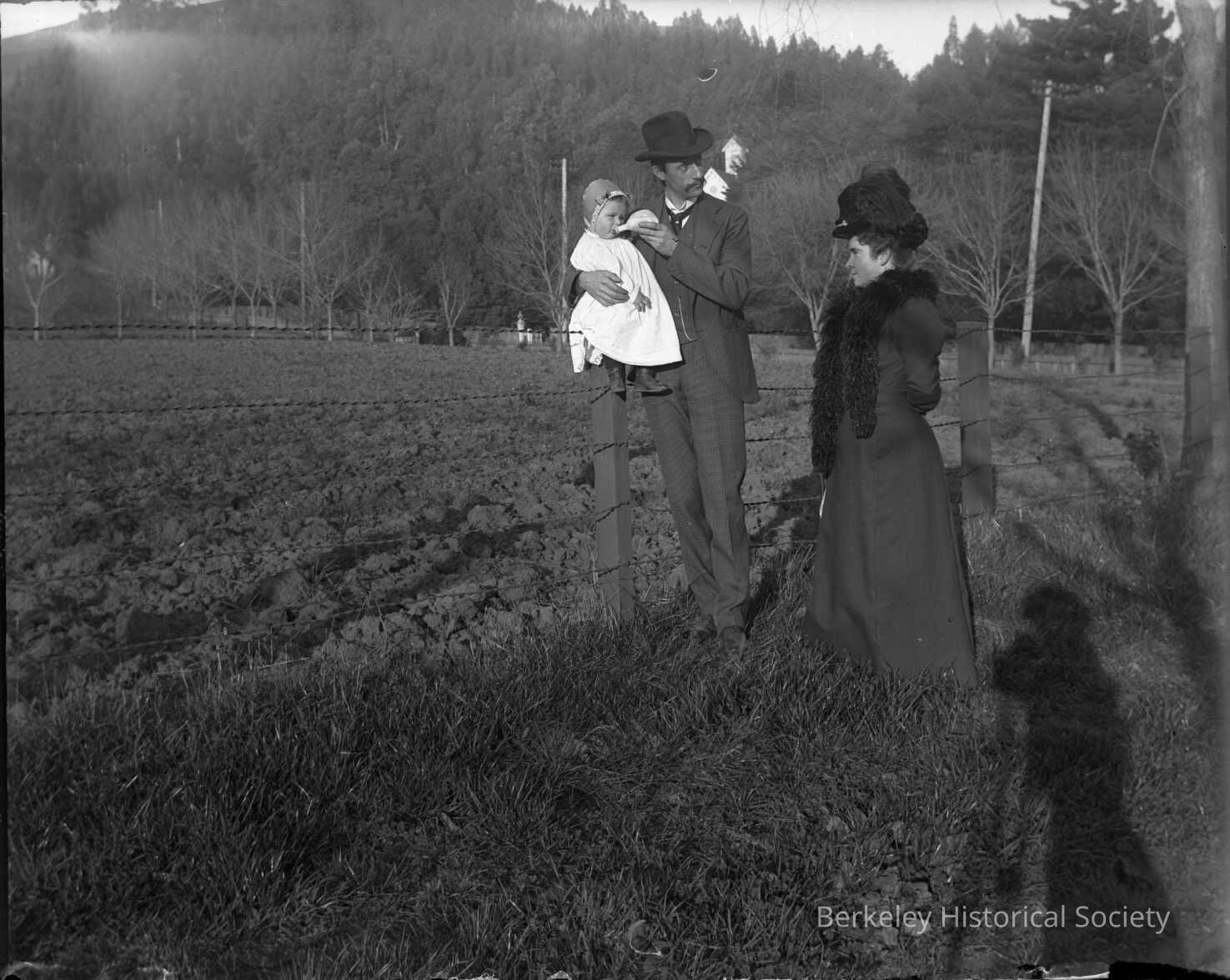 Mr. and Mrs. Post standing at barbed wire fence, holding a baby on the fence post. Mr. Post is feeding the baby from a bottle. Russell and Claremont. This is the same image as the record 496-190-9537