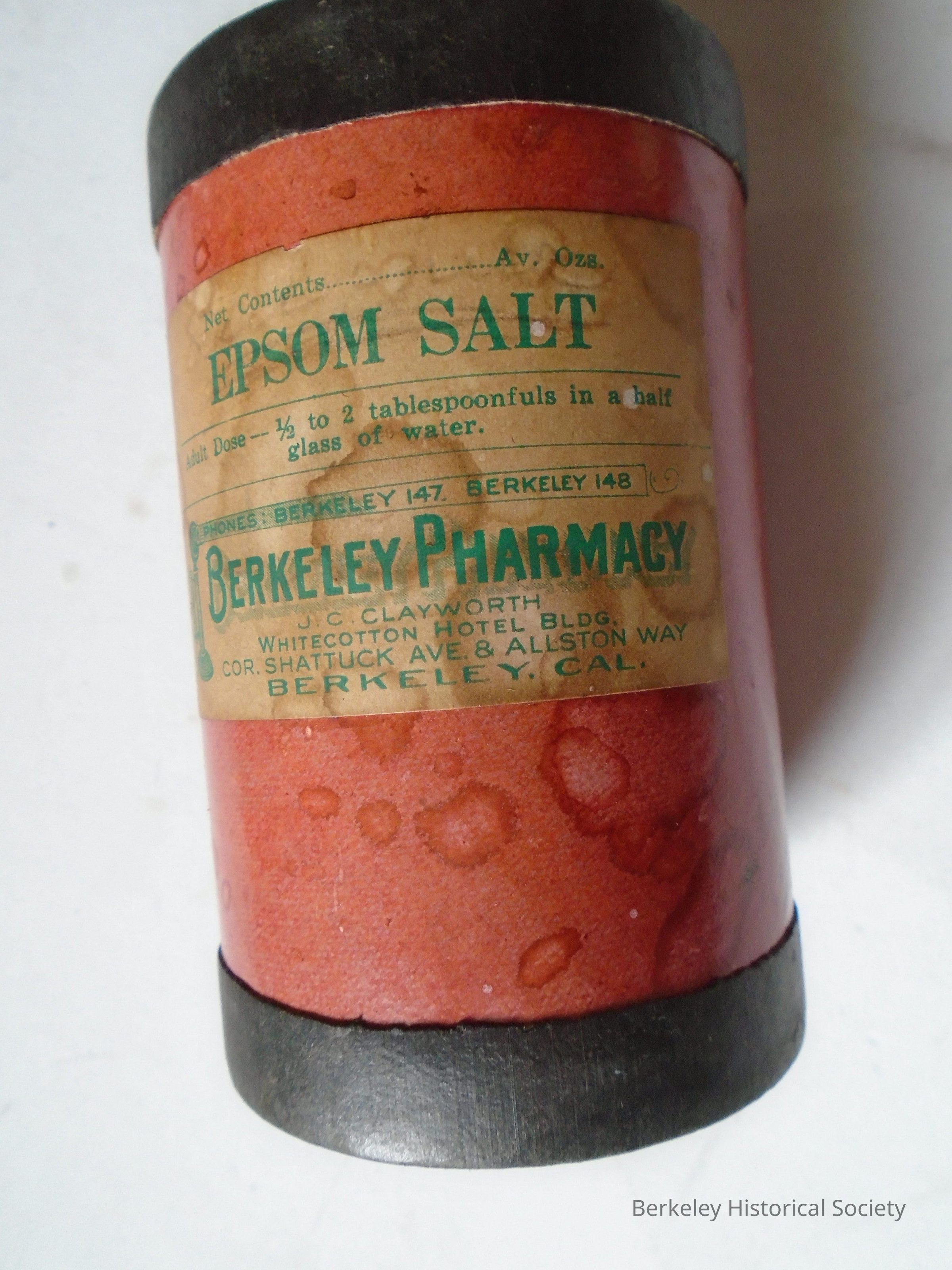 Red and black cardboard and paper container for Epsom Salt from Berkeley Pharmacy, corner Shattuck Ave. & Allston Way, Berkeley, Cal. Phone Berkeley 147 & 148.Made/Created