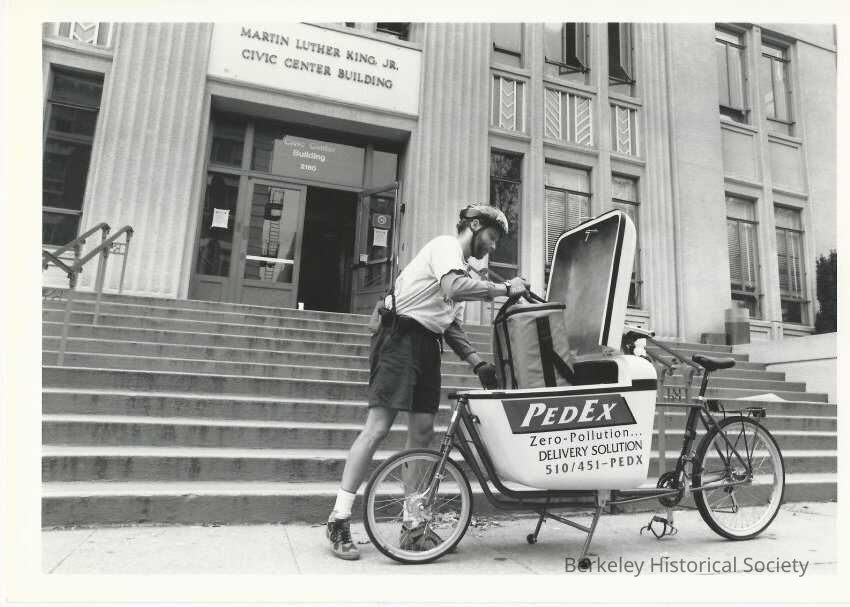 Loading package on PedEx delivery bicycle.