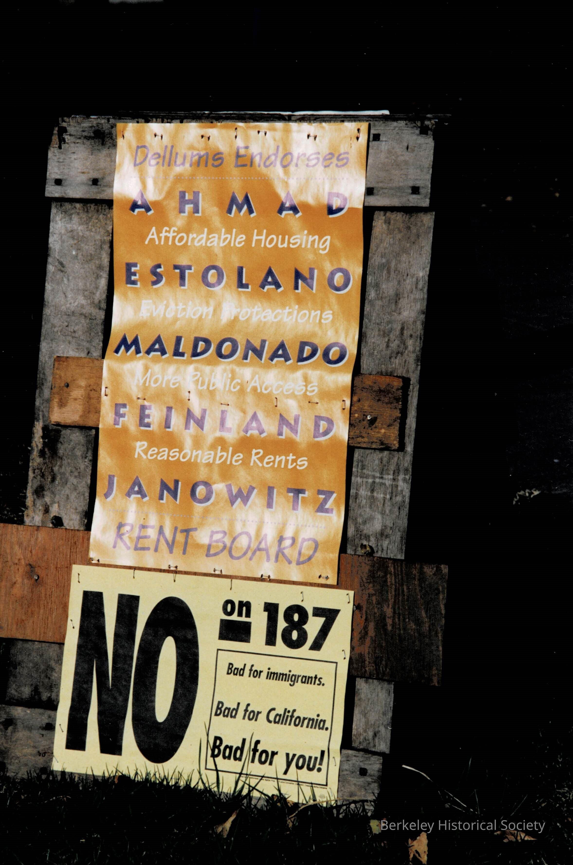 Photograph of poster for Dellums endorsements for rent board, 1994, for Ahmad, Estolano, Maldonado, Feinland, Janowitz. Below this is smaller poster: No on 187. Color snapshot.Lexicon