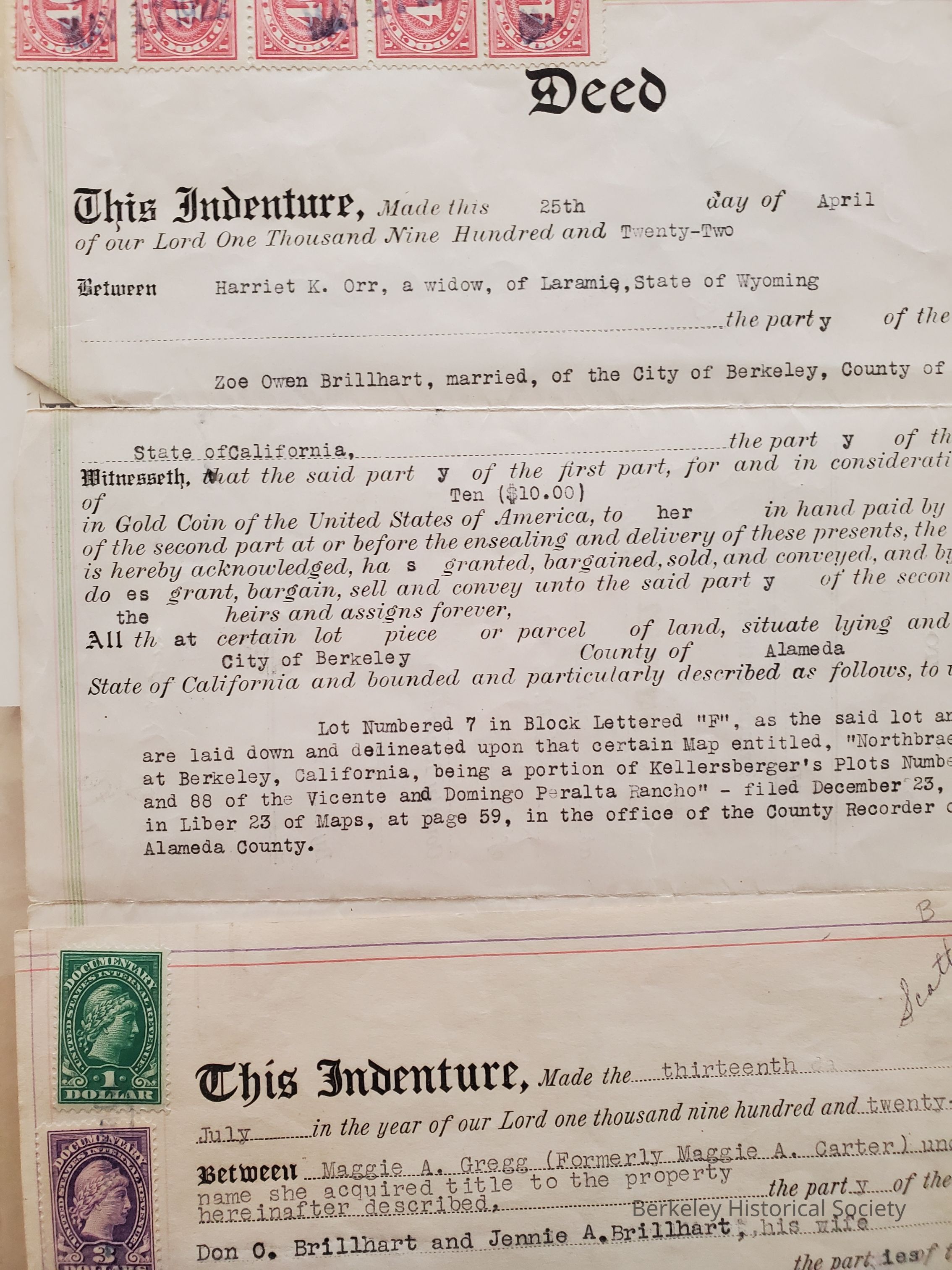 One deed conveys property from Harriet K. Orr to Zoe Owen Brillhart, April 25, 1922; other deed converys property from Maggie A. Gregg (formerly Maggie A. Carter) to Don O. Brillhart and Jennie A. Brillhart, July 13, 1922 (incomplete).Lexicon