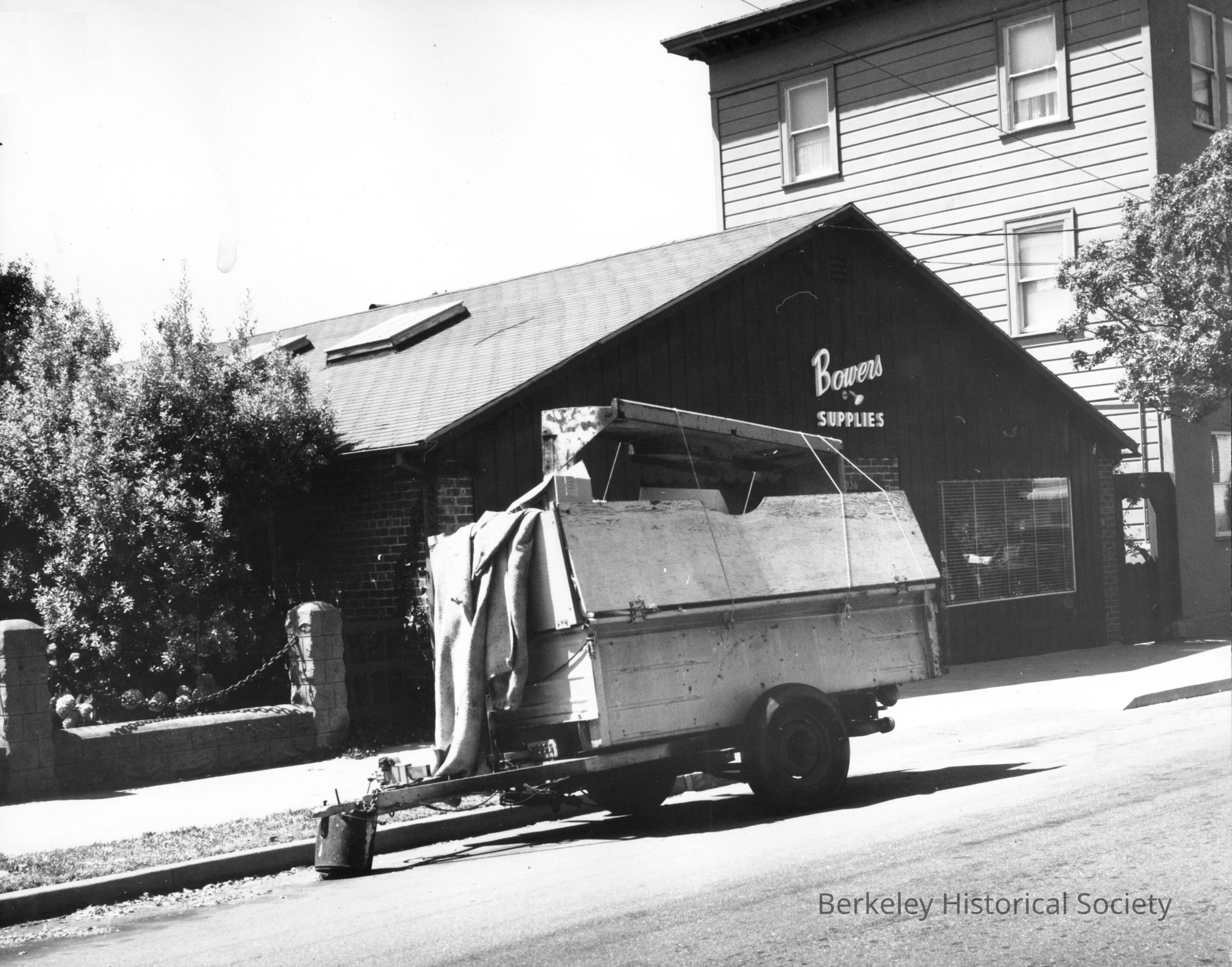 Apparently hand designed trailer loaded with unidentified object; parked at 3026 Tremont Street, with Bowens Supplies in background.