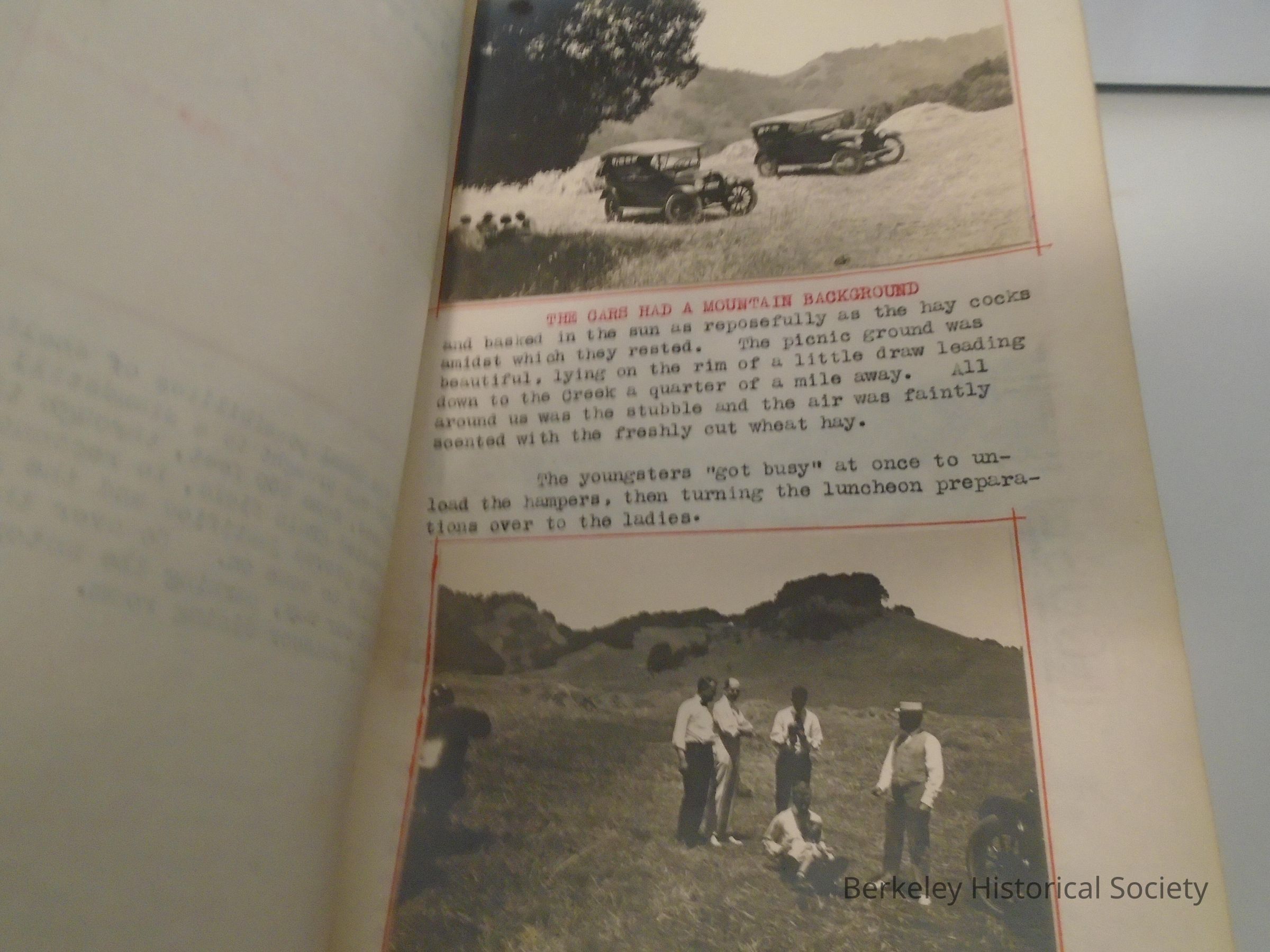 Diary/logbook of automobile day trips taken away from Berkeley on various roads surrounding the area by Charles L. Trabert and his family. Many photographs with captions and extensive writing/text by Charles Trabert about what was seen, what they thought and what they did. Very well written, humorous and thought out. Author is well educated on the vistas, vegetation, buildings and history of the area. Text and photos on the page are well organized and highlighted by red ink. Text has been typed. Trips are numbered. This book includes Trips 107- 124 and appears to be the summer trips of 1916. Bound in leather covers with bolts. Charles Trabert address: 2736 Elmwood Ave.