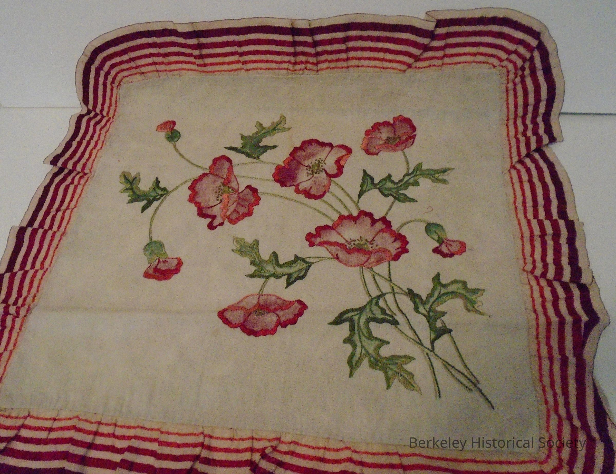 Hand embroidered cotton rectangular doily or cover for table or pillow. Beige with red and green flowers (poppies?) embroidered in middle. Red and beige striped ruffle around the edge. From the home of Alice Sylvester Brown & husband & sons.