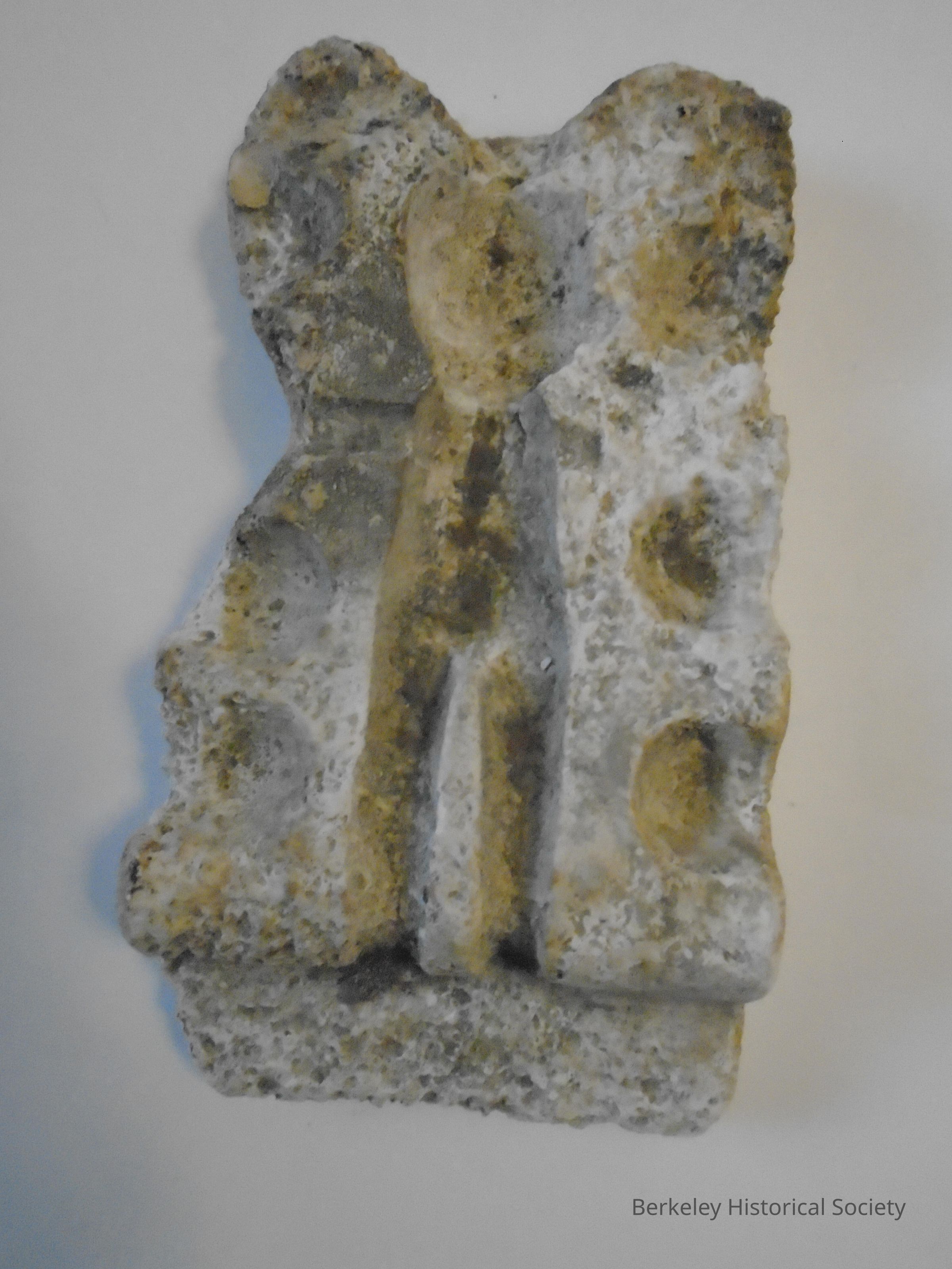 White plaster doll mold from the Storybook Doll Factory. Rectangular shape, about 8" x 4", and 1.5" thick. Smooth on one side. Mold-side is dusty and dirty. Mold shape appears to be for a small doll, about 6" tall, with a few additional indentations next to the main shape that may be for extra heads or other doll pieces. Found at demolition site at Rose and Cedar St.Lexicon