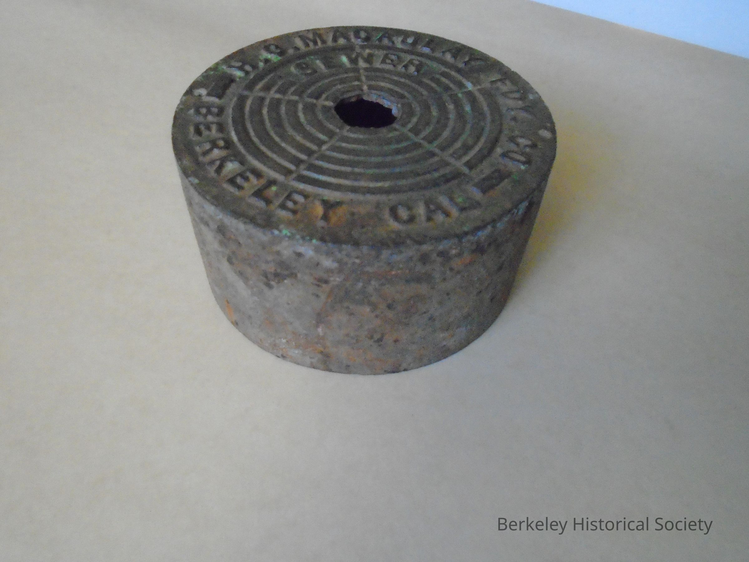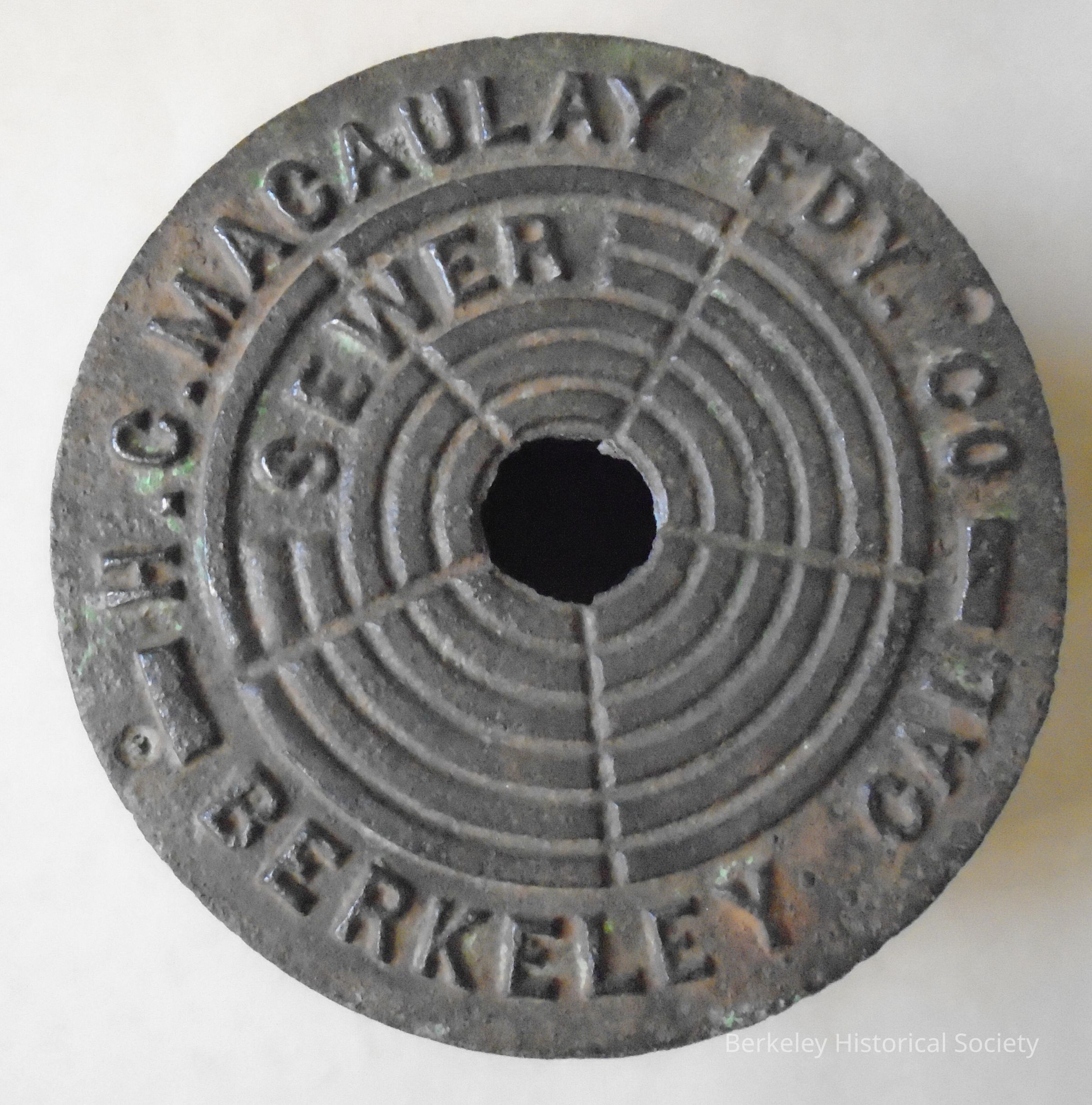Iron sewer drain cover made by H C Macauley Foundry. Round top with sides like a short, hollow column. Finger hole in the center of top for lifting. Slightly rusted and pitted around sides. Inscribed on top, in raised letters: "H.C. Macaulay Fdy. Co Berkeley Cal" and underneath "Sewer".