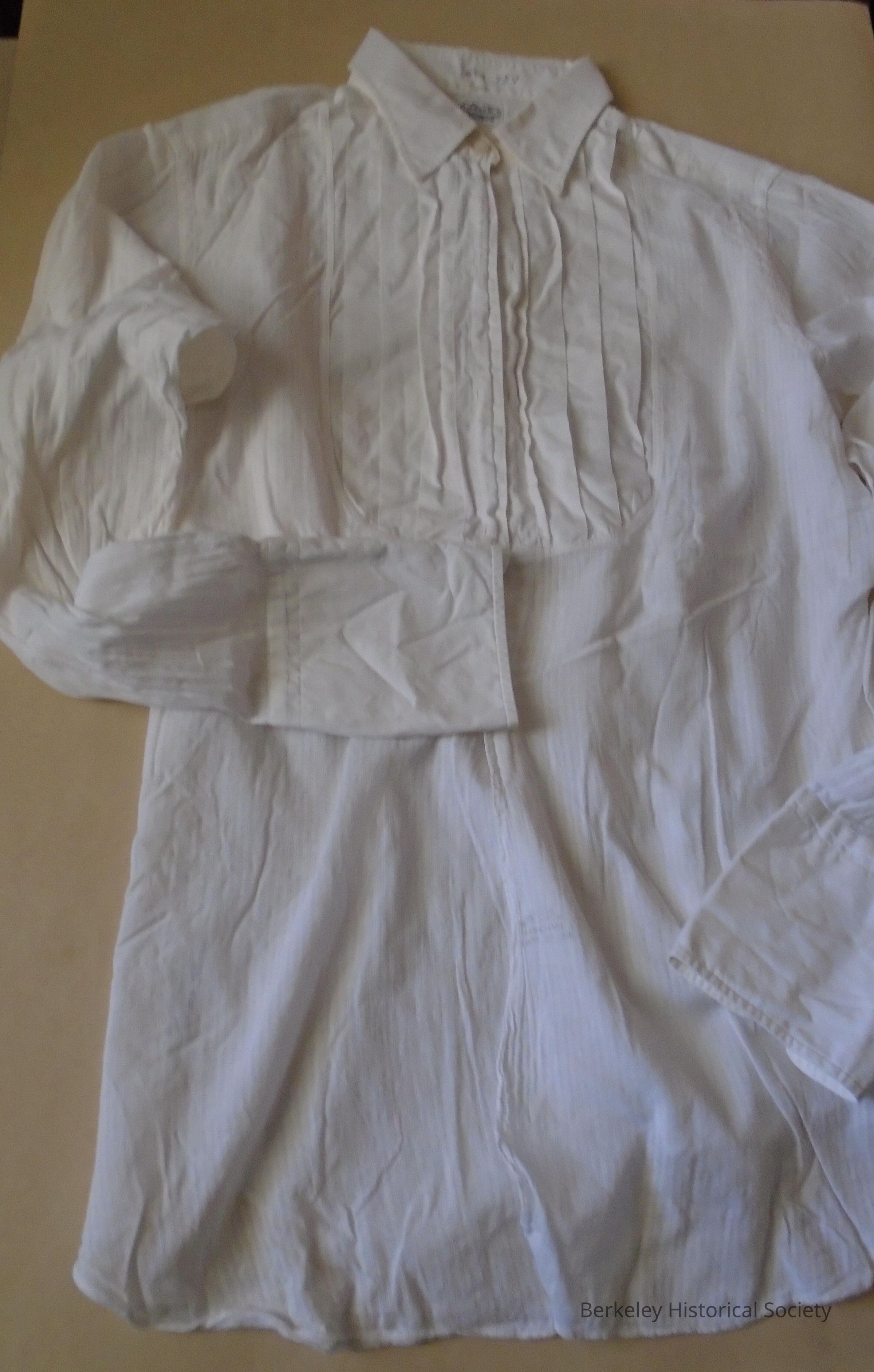 White, cotton, tuxedo shirt with collar. Pleats in front, two buttons (top and bottom). Label: Arrow, sanforized. Belonged to Ferguson family who lived at 32 Hillcrest Rd. in Berkeley.